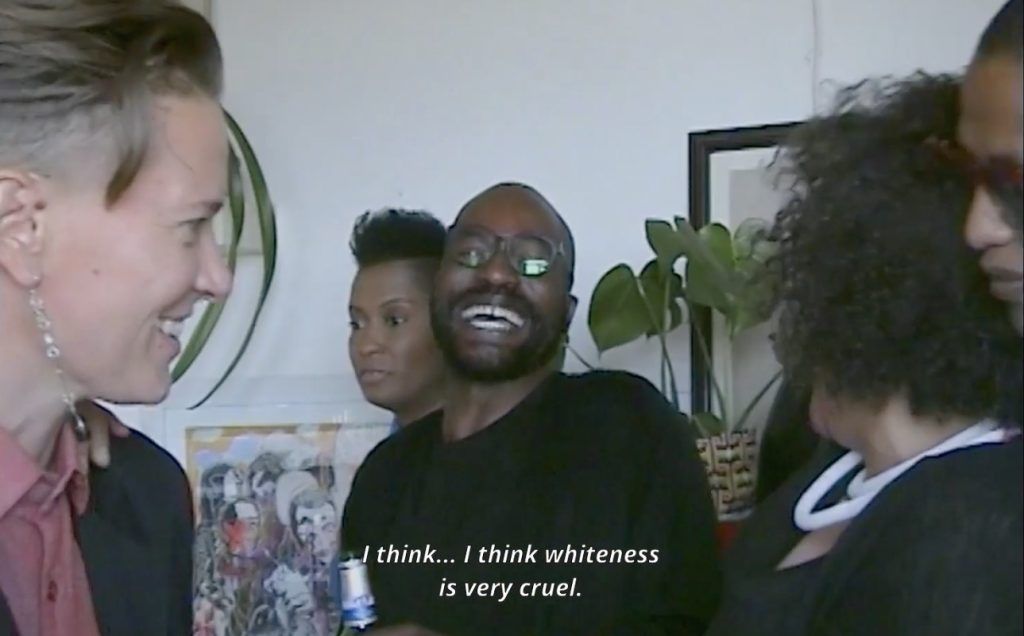 In the fourth part of the film, Milisuthando examines her relationship with whiteness through her  friendships with two white women: Marion Isaacs, the film’s producer and Bettina Malcomess, an artist and academic. For this part, Milisuthando decided to create a “visual silence” so the scenes would function as a “confessional” and viewers could also introspect “their own thoughts around intimacy and race” without projecting too much on Marion or Bettina. She chose to remove the image and show a black screen because she knows her generation is “tired of seeing white people crying and inadequately speaking about race”, so naturally “defences would go up”.