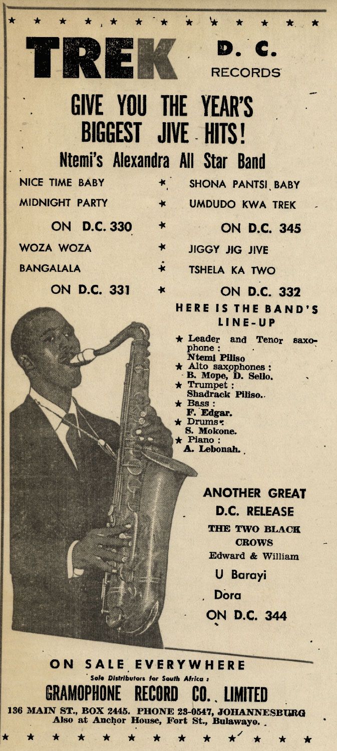 Though just seven musicians, we were so popular! Even in Rhodesia [now Zimbabwe] they wanted us. People used to go to Rhodesia, and come back and say, “Hey, you guys must go to that place, they want you! They want Ntemi’s Alexandra All Stars Band!” And at home, our popularity spread across the whole country. We became almost as big as the Jazz Maniacs and the Harlem Swingsters. For example, in December 1955 we went on a tour of the Cape, including Cape Town. And even though we were competing with big bands, especially in Port Elizabeth, East London and Cape Town, the seven of us would blow the roof off! Those big bands, like Eric Nomvete’s band[17]This is a reference to the African Quavers Swing Orchestra, a big band led by Eric Nomvete; it later became known as the Havana Swingsters. In a different context, Nomvete also enjoyed success leading a group named the Big Five. in East London, they were very popular, playing orchestrated music, swing. The audiences there had heard one or two African jazz things, but they didn’t care much for them until we came along and they heard our African jazz!