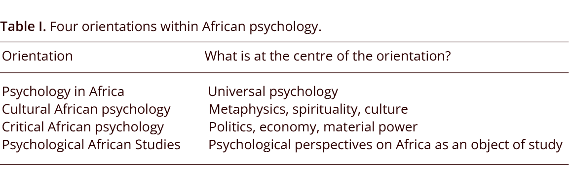 The four African psychologies are African psychology (a) as psychology in Africa; (b) as a culturally, metaphysically, or spiritually inclined African psychology; (c) as a materially, politically, or critically inclined African psychology; and (d) as psychological African Studies (Table 1). We shall refer to them as psychology in Africa, cultural African psychology, or critical African psychology and, of course, psychological African Studies.