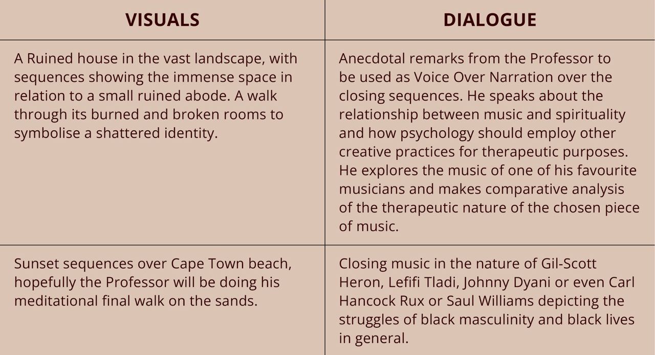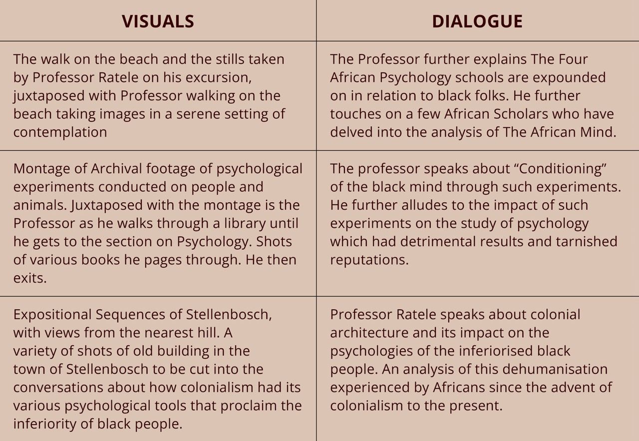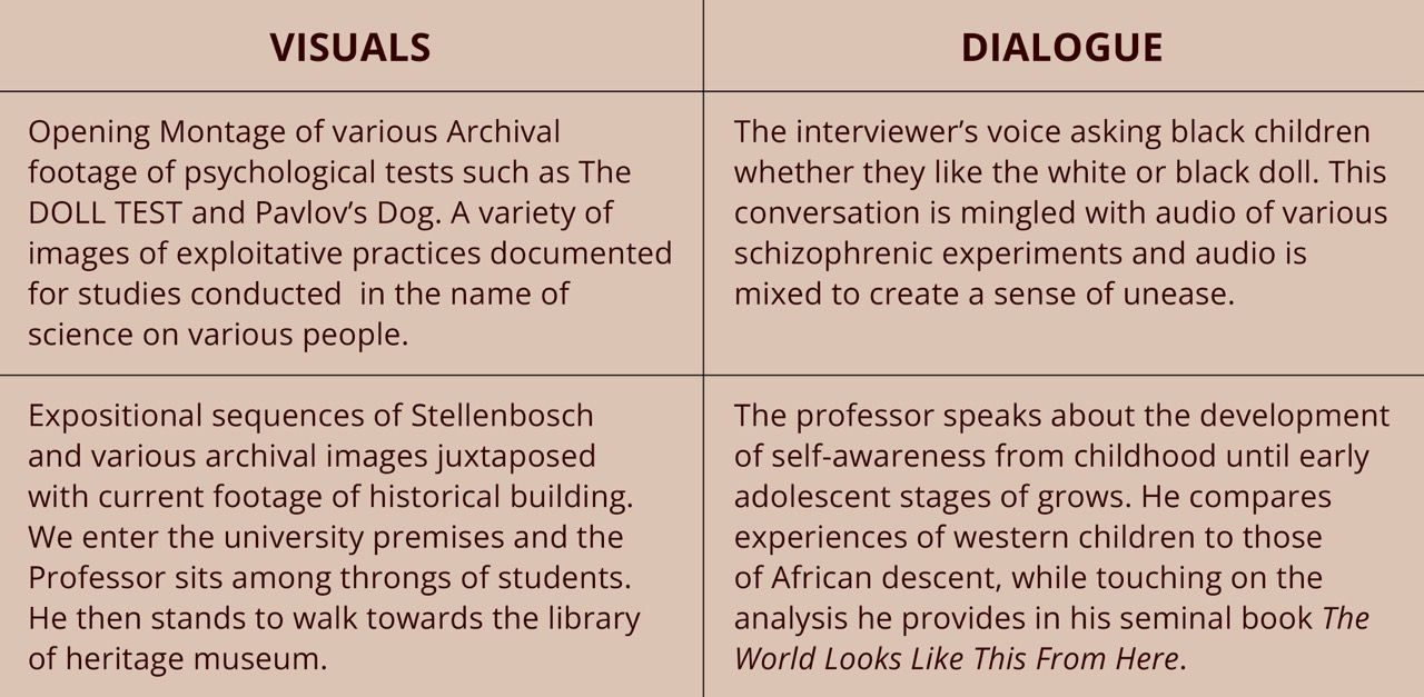 The OUTLINE is mere draft of how the narrative will be crafted into a 10 minutes video poem, which will serve as both submission for herri, and as a possible teaser for a longer version. Currently, the video artist is crafting an opening sequence that is under a minute long, which uses archival material and the video artist’s own footage together with edited audio from Professor Kopano Ratele’s lectures found online.