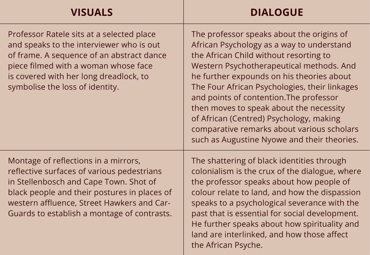 The video poem is a dream where the viewer meets a psychotherapist who explores a variety of topics that pertain to African experiences of how the west analysed and formed our variety of identity definitions.