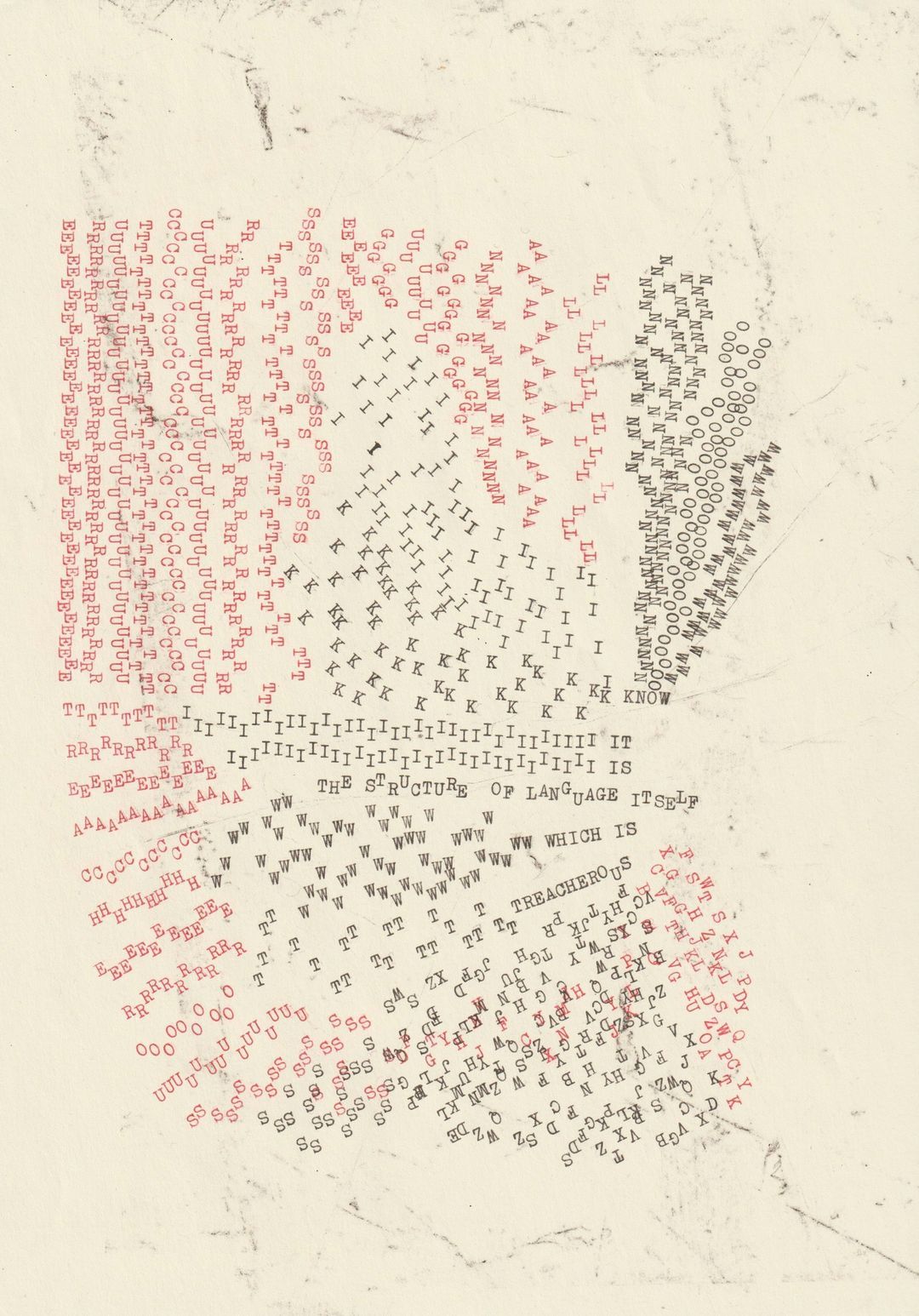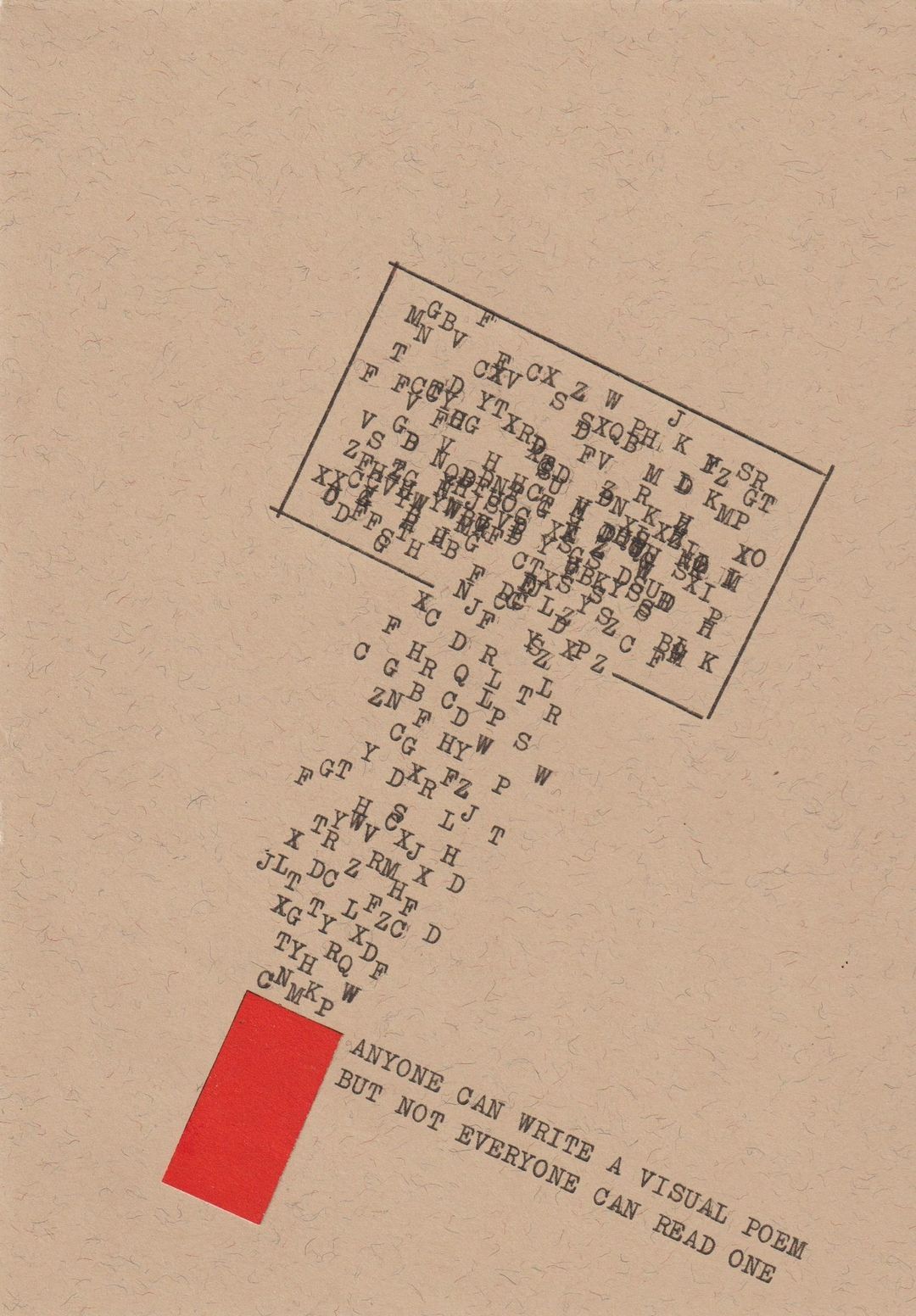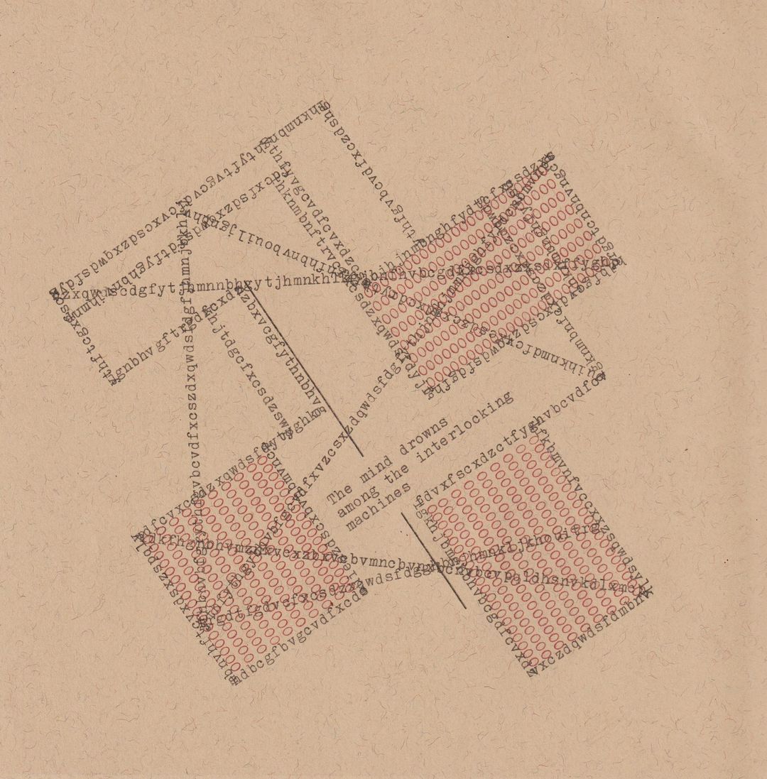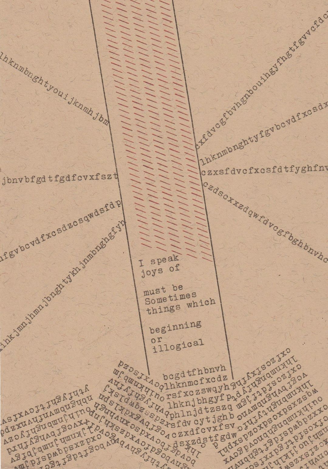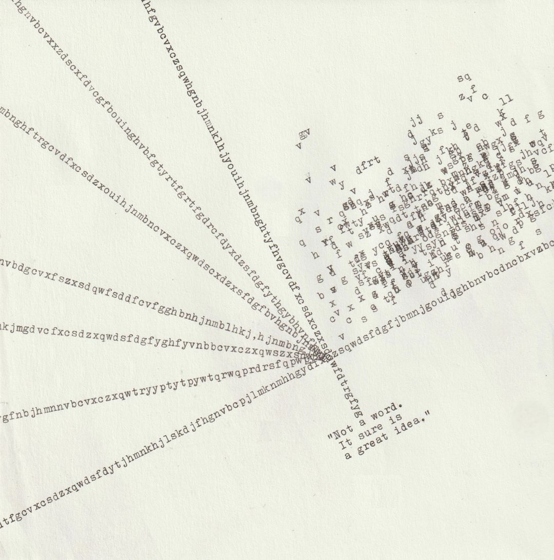 Once I got over the Fine Artist’s craving to be exhibited in a conventional gallery, books became the logical medium for my art; they’re affordable, and with online printing, relatively easy to produce. Dieter Roth, Eduardo Paolozzi, and Robert Rauschenberg have all inspired me, along with the Dadaists and Pop Art movements. Music—Jazz in particular—has inspired me for decades, the latter because it involves improvisation, and I improvise all the time when typing. So in that sense I’d also have to name players like Charlie Parker and Miles Davis, along with the maverick genius, Sun Ra. He once said, “Why don’t you do something right and make a mistake?,” which, in essence, is a concept I hold dear. No one can force mistakes, but imperfections arising from “mistakes” are appealing to me. No visual poet has shaped my style, but the collective evidence of works made since the ‘60s inspires me and suggests a few ideas. If I had to name one visual poet though it would be Bob Cobbing. I can’t claim to be truly “original,” but as I work there are no ghosts of poets past sitting on my shoulder. In that respect, I’m mercifully free of the burden of influence.