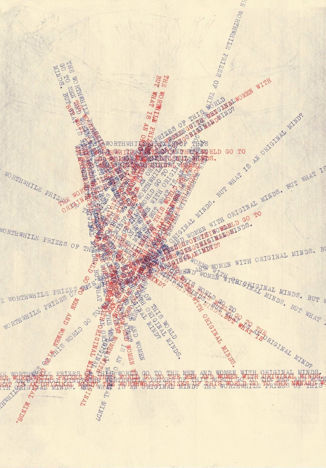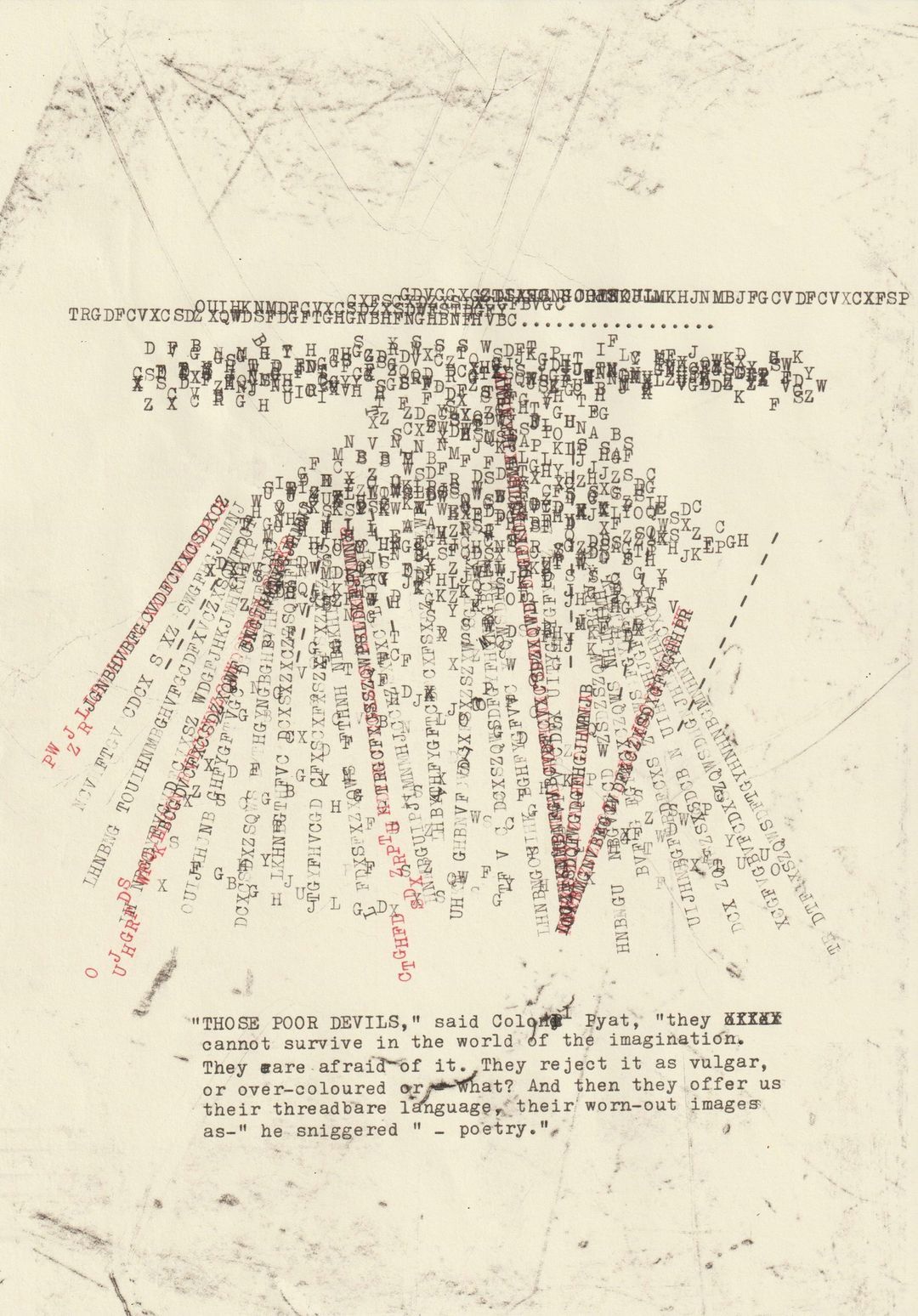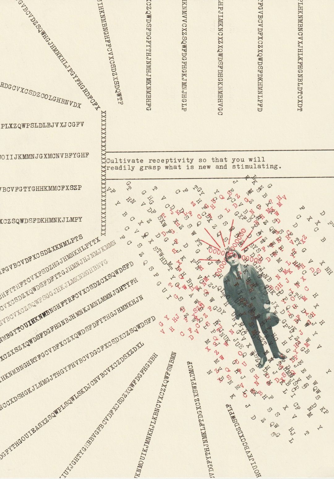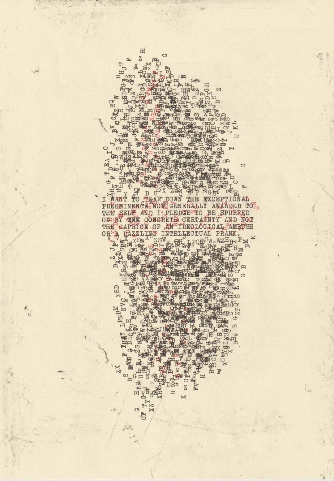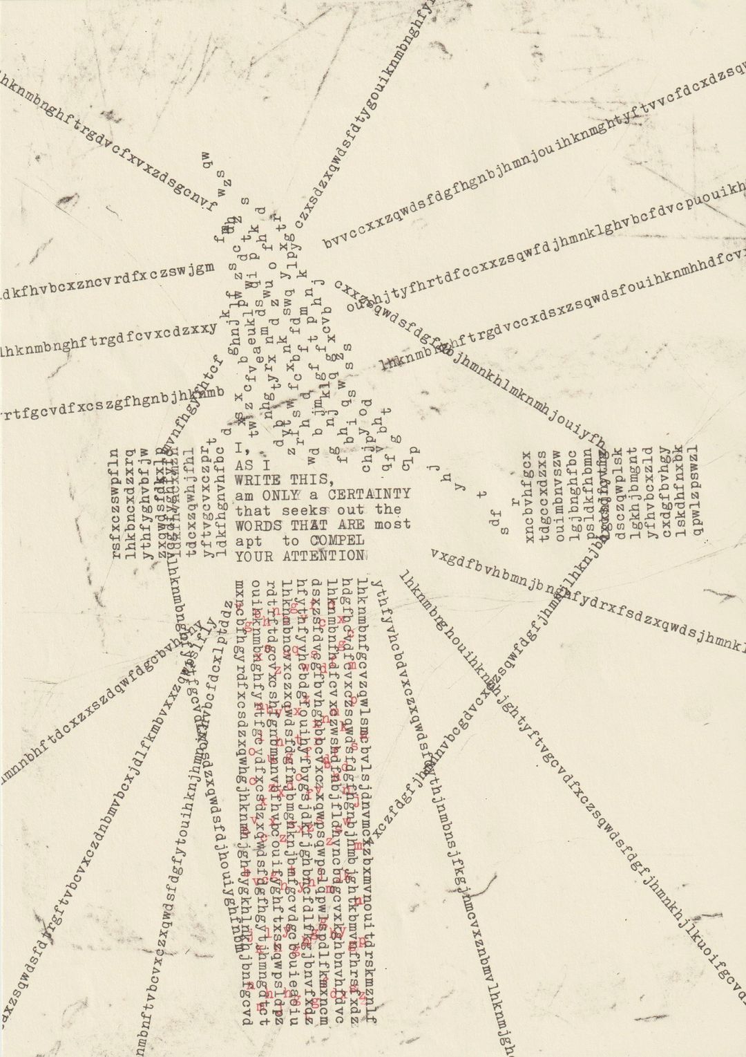 Once I got over the Fine Artist’s craving to be exhibited in a conventional gallery, books became the logical medium for my art; they’re affordable, and with online printing, relatively easy to produce. Dieter Roth, Eduardo Paolozzi, and Robert Rauschenberg have all inspired me, along with the Dadaists and Pop Art movements. Music—Jazz in particular—has inspired me for decades, the latter because it involves improvisation, and I improvise all the time when typing. So in that sense I’d also have to name players like Charlie Parker and Miles Davis, along with the maverick genius, Sun Ra. He once said, “Why don’t you do something right and make a mistake?,” which, in essence, is a concept I hold dear. No one can force mistakes, but imperfections arising from “mistakes” are appealing to me. No visual poet has shaped my style, but the collective evidence of works made since the ‘60s inspires me and suggests a few ideas. If I had to name one visual poet though it would be Bob Cobbing. I can’t claim to be truly “original,” but as I work there are no ghosts of poets past sitting on my shoulder. In that respect, I’m mercifully free of the burden of influence.