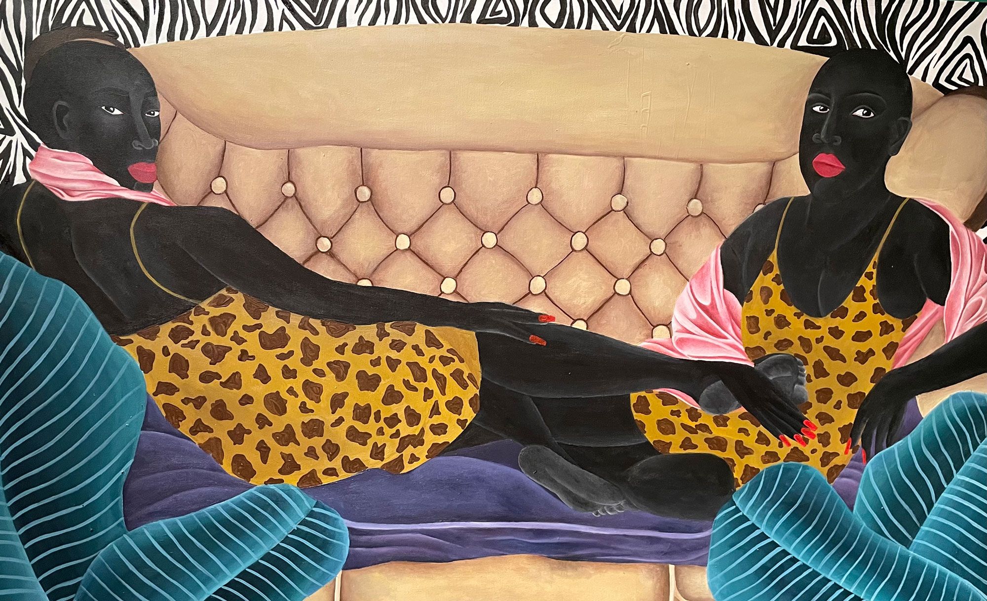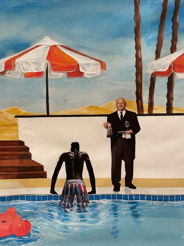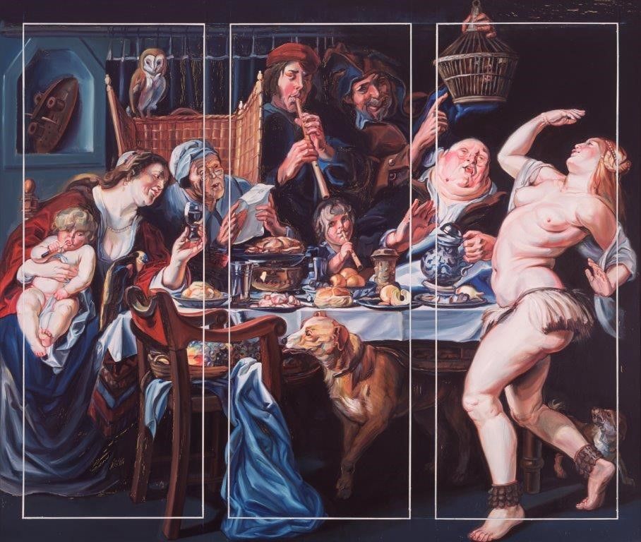 I will end with a look at the image that Kopano brought to the discussion. Johannes Phokela has been quoted as saying: “most of my work is a contemporary take on Old Dutch and Flemish Masters where I take on what is perceived to be Europe’s grandiose history of art as a medium to convey values and ideals represented within a global context of cultural elitism.”[11]Dlamini, Ndaba. 2006. ‘Phokela exhibition celebrates mentor’. [Online]. Available: joburgnews (this site has expired), the citation can also be found in The Life and Work of Johannes Phokela. 2009. The Standard Bank Learner Series. Philippa Hobbs & Emile Maurice. Compiled by the Heritage Agency CC, with assistance from Nhlanhla Ngwenya. You can download the PDF here. Thembinkosi Goniwe argues that Phokela is concerned with the dilemma of black subjects in modern European art history (and through a history constructed through painting).[12]Goniwe, T. 2017. Contemporary South African Visual Art And The Postcolonial Imagination, 1992 -Present. PhD Thesis: Cornell Theses and Dissertations, here. For Goniwe, within this visual history, there are two key issues: first, the exclusion of black subjects in master narratives and second, the denigrating ways in which black subjects are depicted in rare moments (Goniwe, 2017: 50).