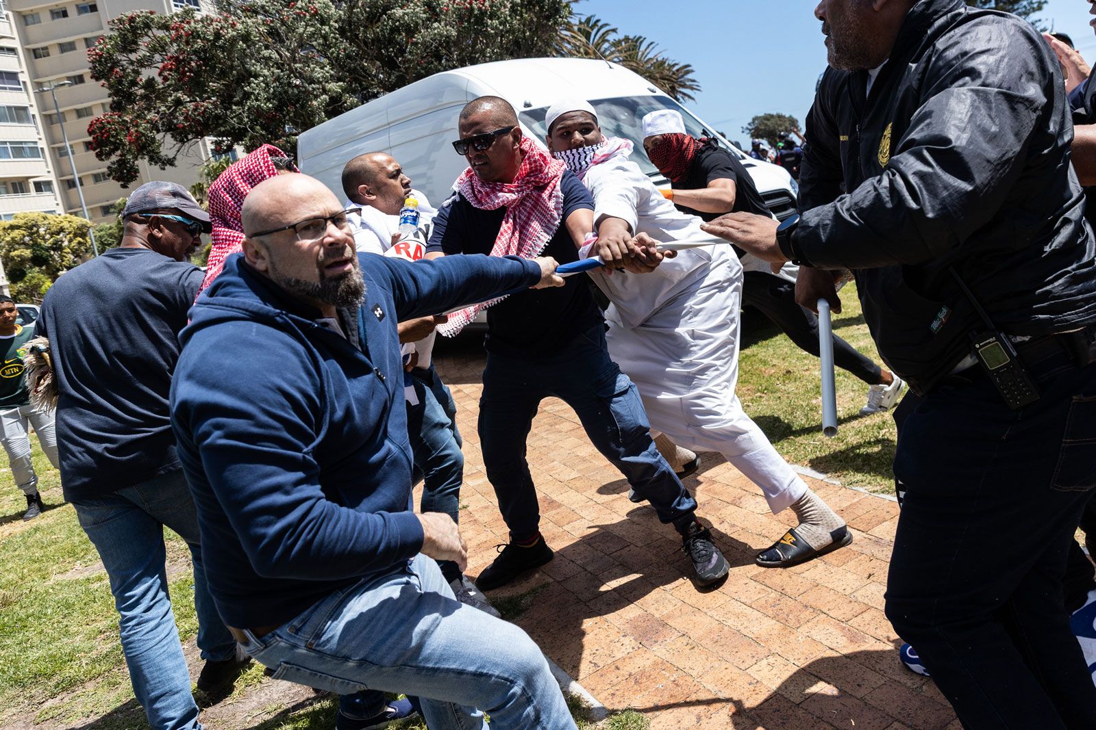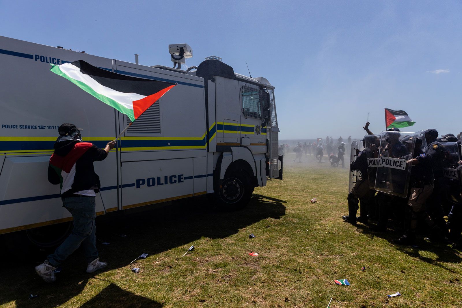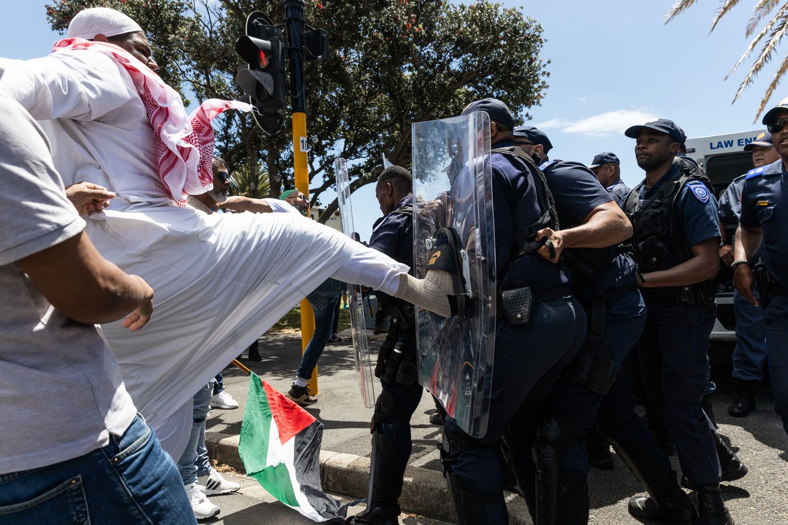 Police and pro-Palestine protesters clash after disrupting a pro-Israel protest in Sea Point, Cape Town on 12 November 2023. (Photo: Ashraf Hendricks / GroundUp)