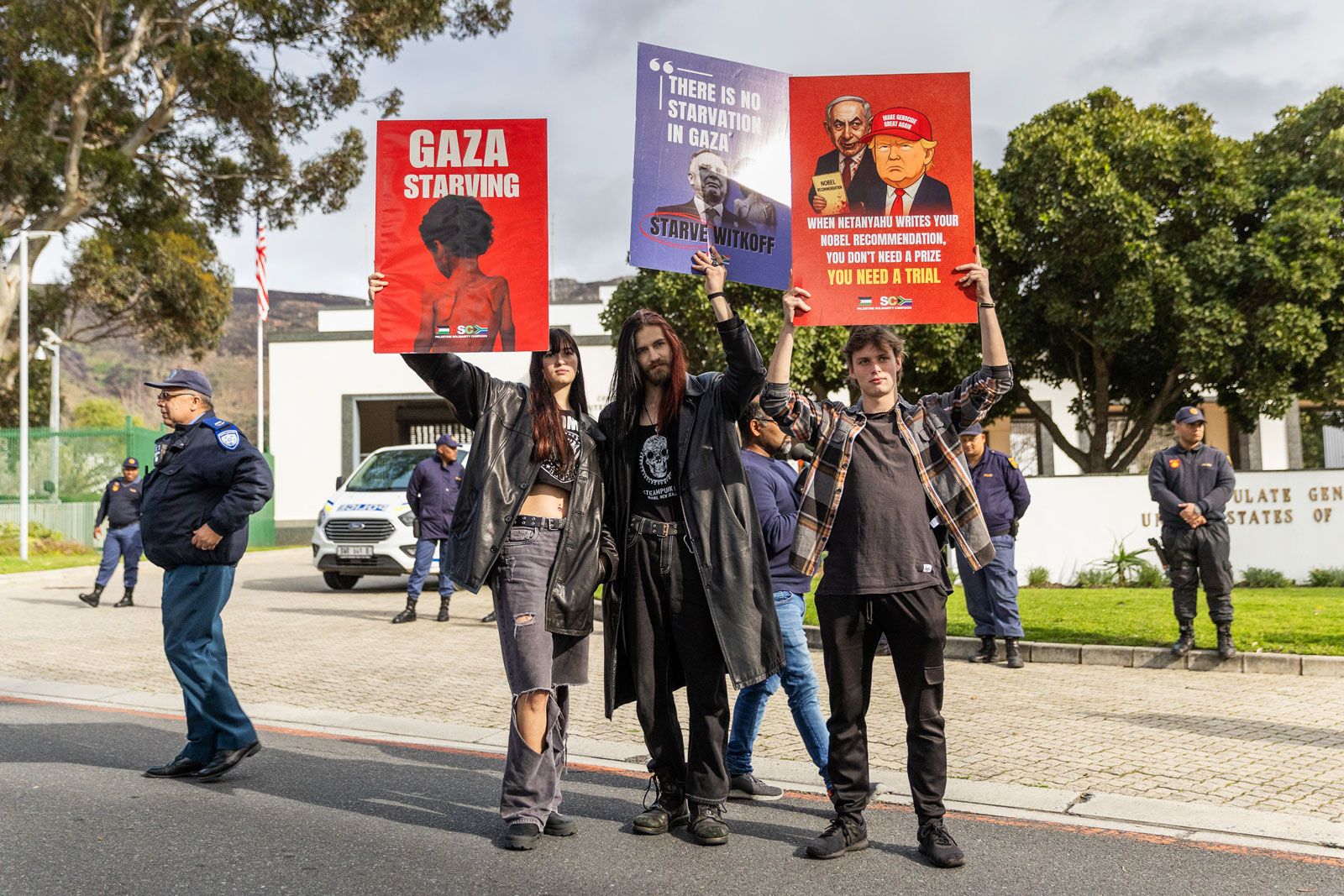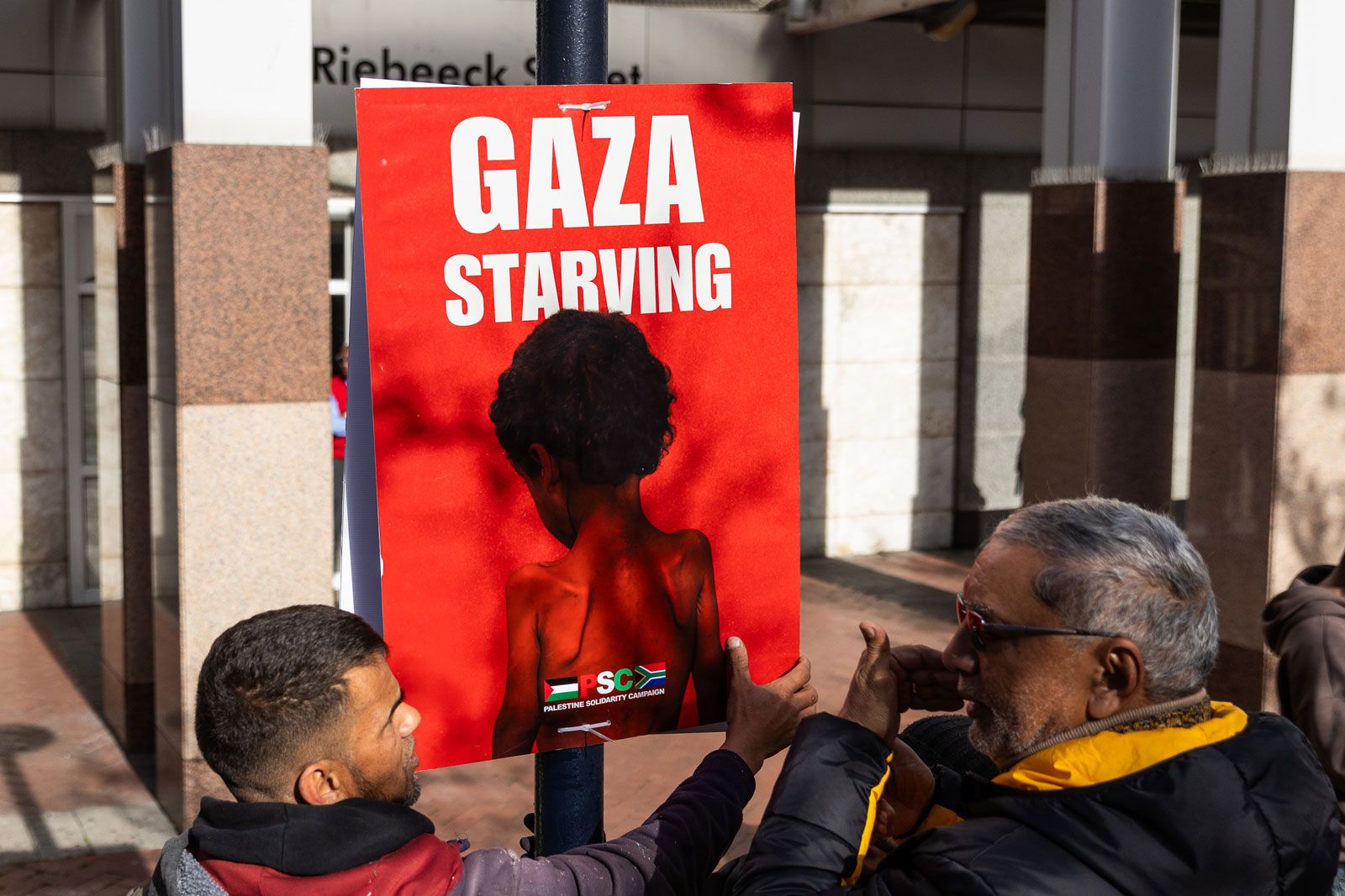 Protesters put up a banner outside the UK consulate in Cape Town 1 August 2025. Protesters gathered outside the consulate demanding immediate relief for the people in Gaza, including the provision of aid, medical relief and shelter.