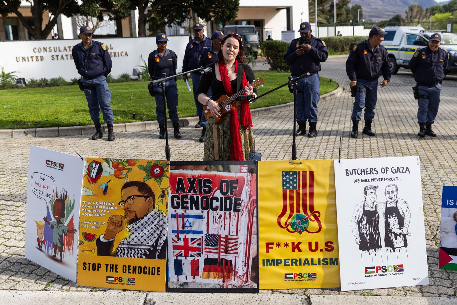 Protesters gathered outside the US Consulate in Cape Town on 8 August 2025. Protesters were calling on America to stop supporting Israel’s war in Gaza. Ashraf Hendricks / GroundUp)
