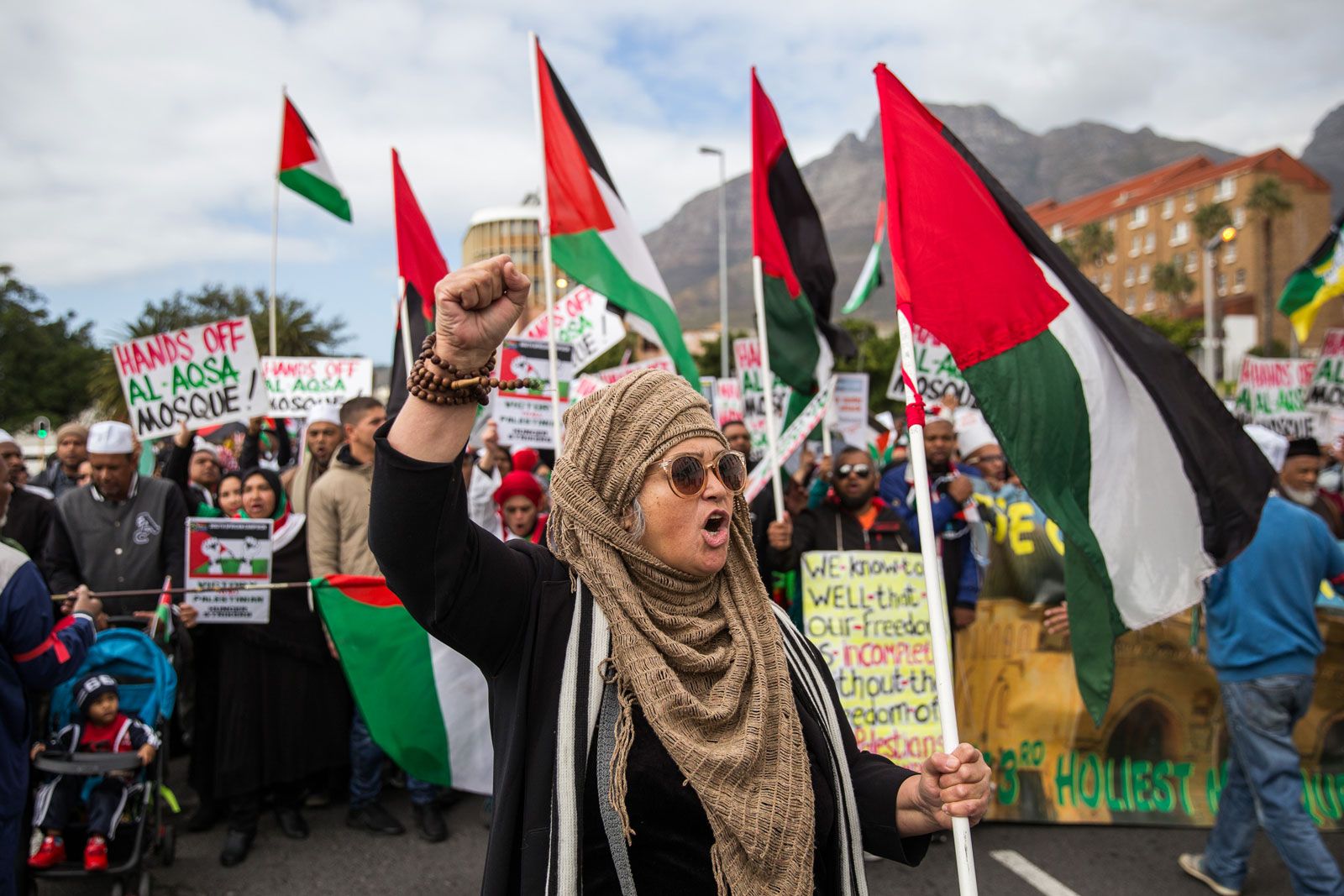 Thousands march to Parliament in Cape Town, on 26 July 2017. Protesters were marching against the installation of metal detectors and other security measures at the al-Aqsa Mosque in Jerusalem.(Photo: Ashraf Hendricks / GroundUp)