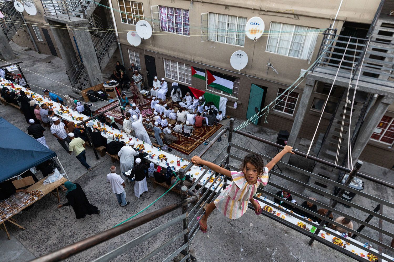 Palestinian flags hang on the walls of the Heideveld flats in Cape Town during iftar in Ramadan on 30 March 2024  (Photo: Ashraf Hendricks/ GroundUp)
