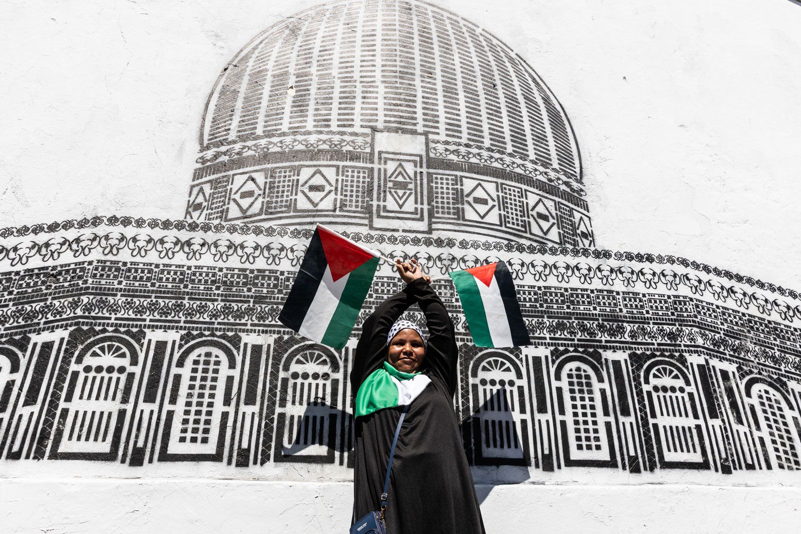 A demonstrator stands in front of a mural of Jerusalem’s Dome of the Rock mosque in Salt River during a pro palestinian march in Cape Town on 22 October 2023. Protesters were marching calling for a ceasefire in Gaza. (Photo: Ashraf Hendricks / GroundUp)