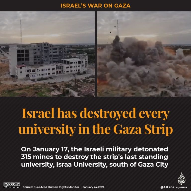 From figures I have dating two months ago, 90 university students have been killed. And the number of school students is 625; that was until last month (the beginning of May). This is the situation that we are dealing with. You have no infrastructure. What you are talking about is not only universities being destroyed; we are talking about the infrastructure of the Gaza Strip, with all its cities. The Gaza Strip has eight refugee camps, almost all destroyed, from Rafah in the south to Beit Hanoun in the north.