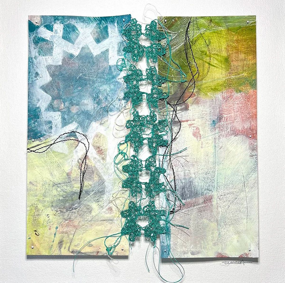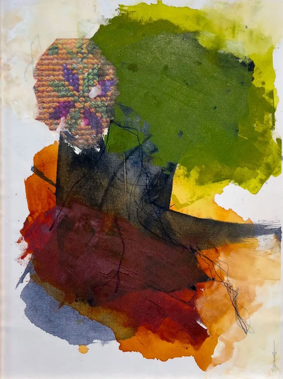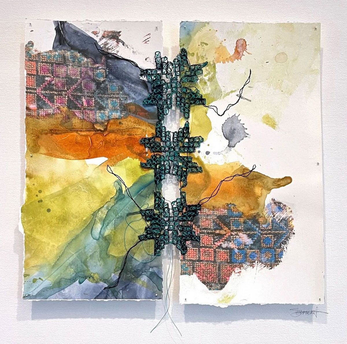 Hussaini reinterprets Palestinian identity through contemporary Tatreez, a traditional cross-stitch embroidery, and the keffiyeh, which is a traditional headscarf. Her freehand stitched designs, created with a sewing machine on water-soluble fabric, blend with multimedia layers on canvas or paper. This intertwining reflects women’s self-expression and the diasporic identity. The torn and stitched layers symbolize the resilience of identity, demonstrating the complex interplay of cultural heritage and socio-political awareness in the face of diaspora.