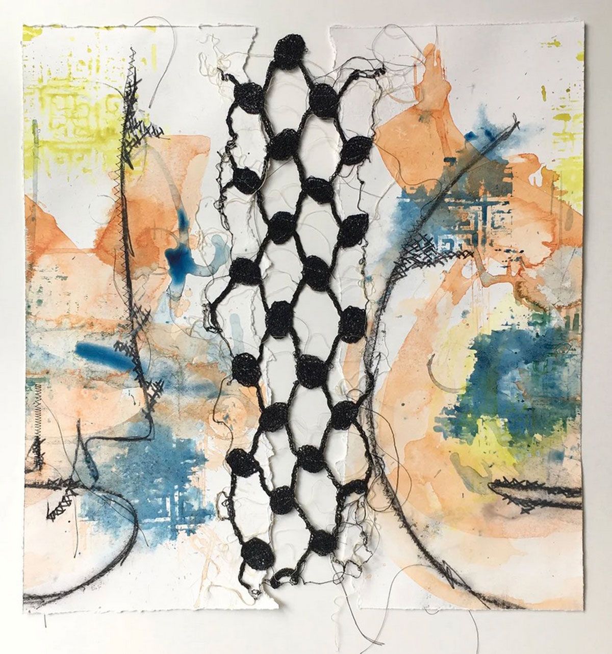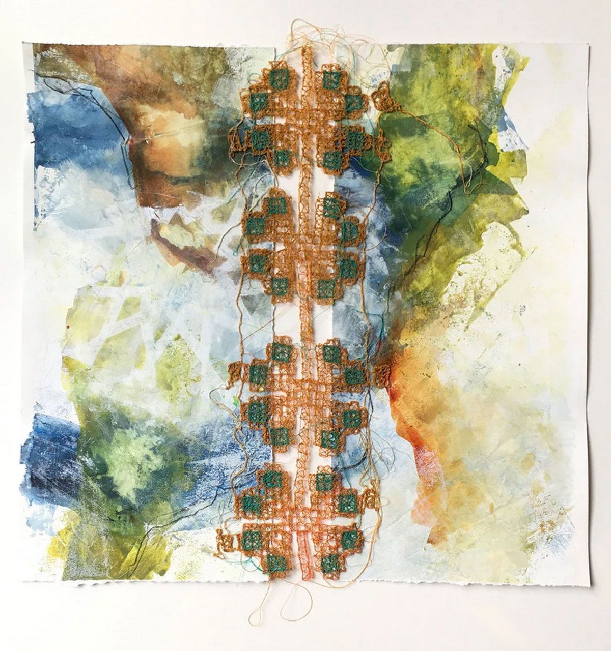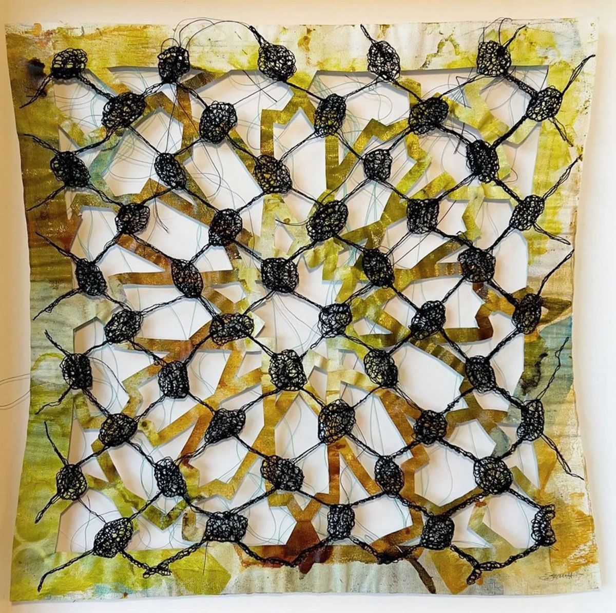 Hussaini reinterprets Palestinian identity through contemporary Tatreez, a traditional cross-stitch embroidery, and the keffiyeh, which is a traditional headscarf. Her freehand stitched designs, created with a sewing machine on water-soluble fabric, blend with multimedia layers on canvas or paper. This intertwining reflects women’s self-expression and the diasporic identity. The torn and stitched layers symbolize the resilience of identity, demonstrating the complex interplay of cultural heritage and socio-political awareness in the face of diaspora.