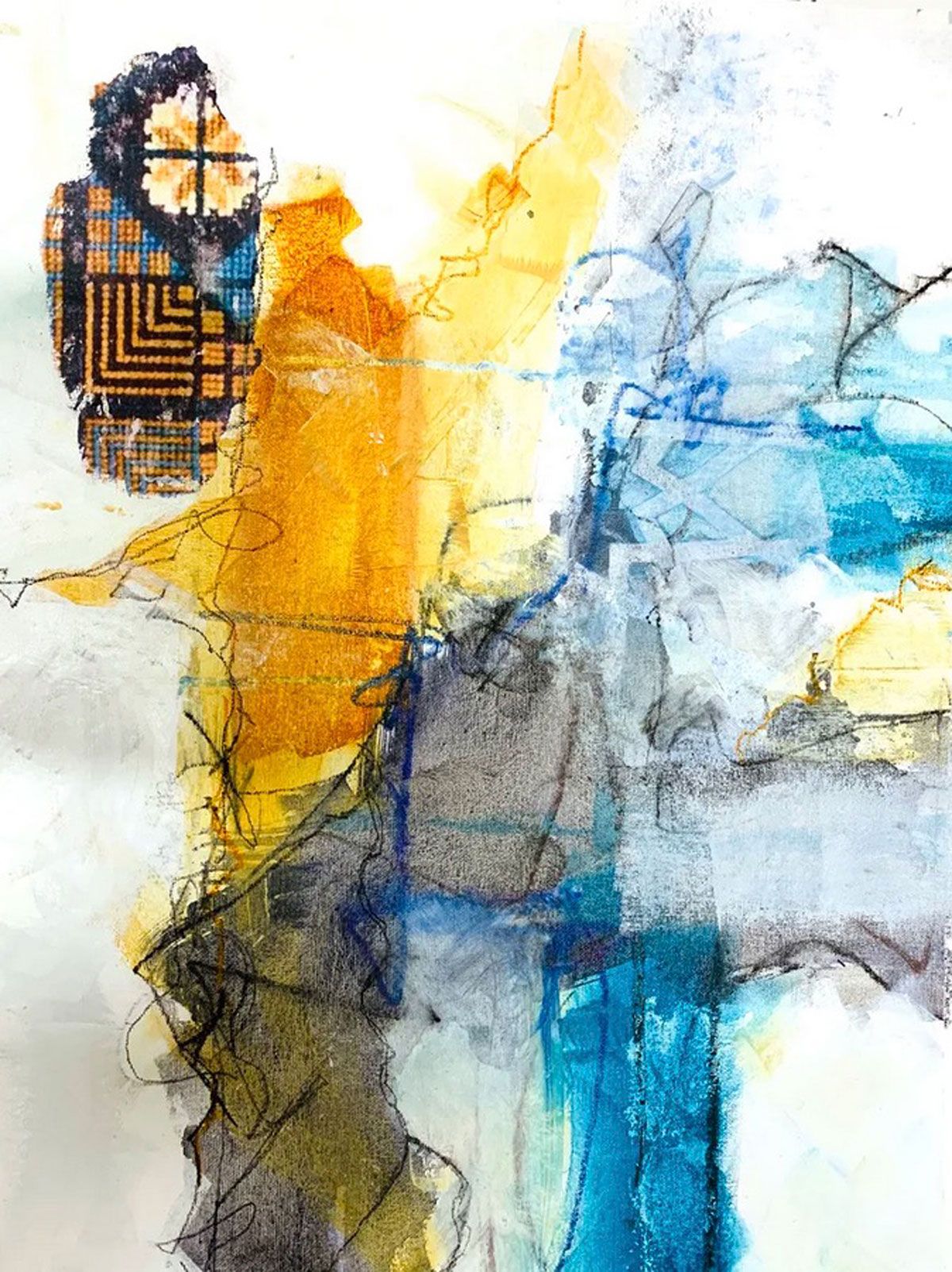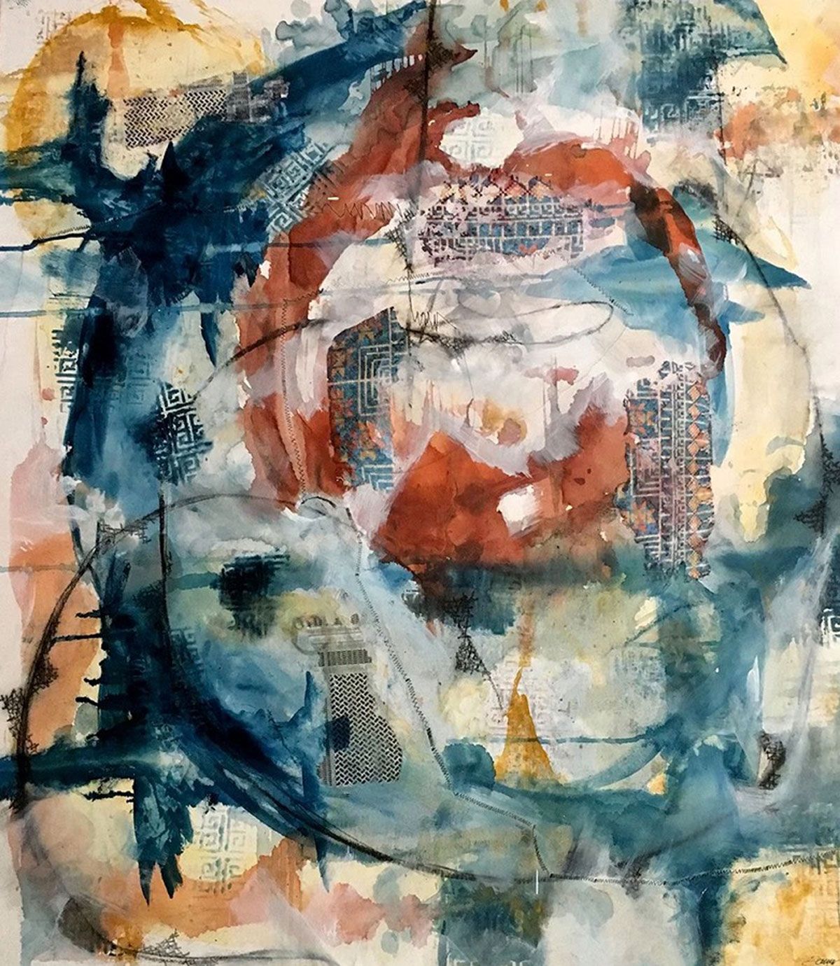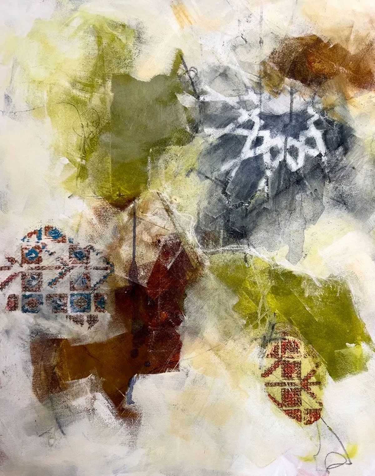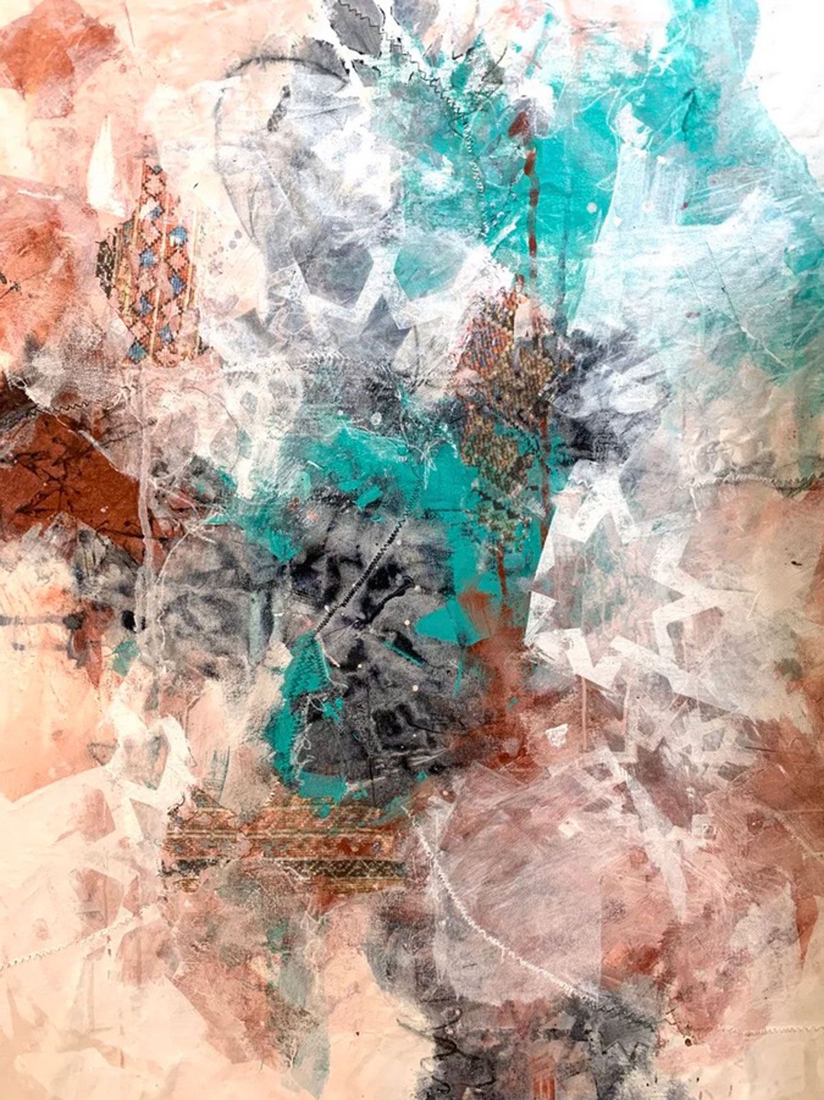 The use of abstraction references a layered history and vibrant culture that aims to tell a positive Palestinian narrative while exploring Arab feminine identity in society. The conflicting tension through overlapping layers of acrylic paint, charcoal, ink, collage, gold leaf, traditional elements, and language creates visual harmony drawing the viewer closer.