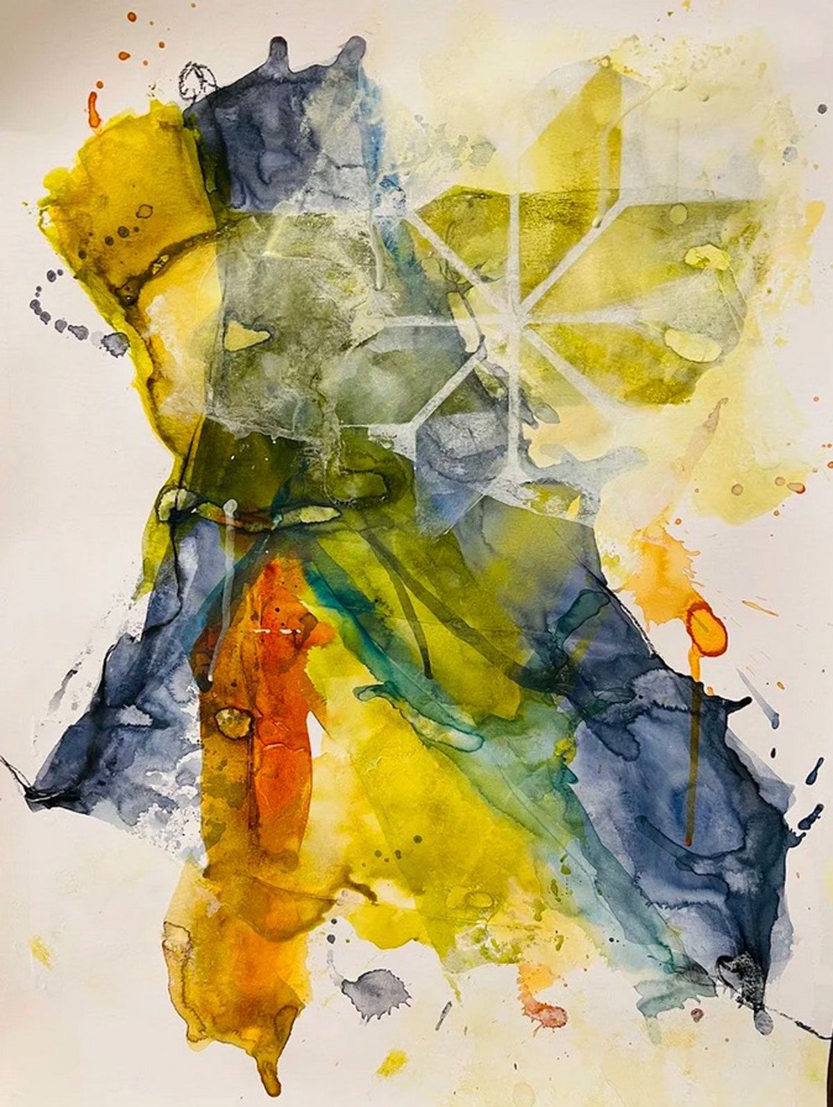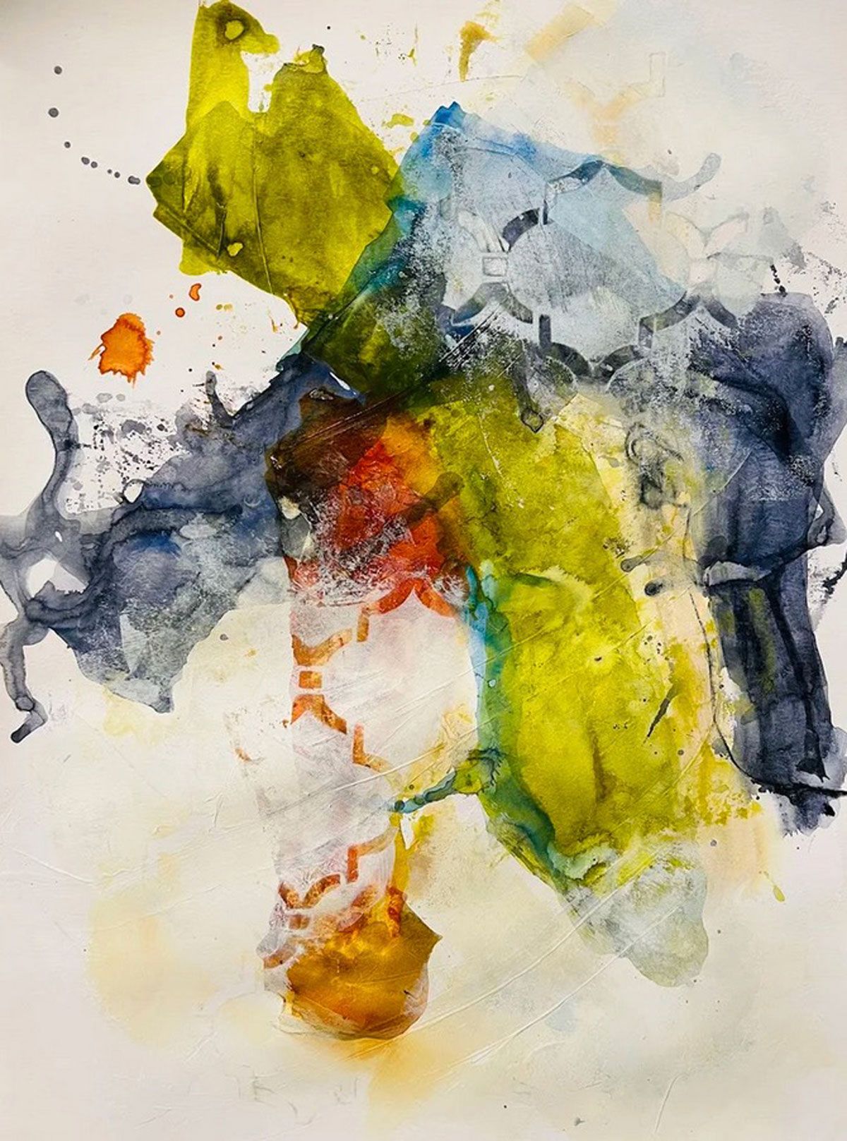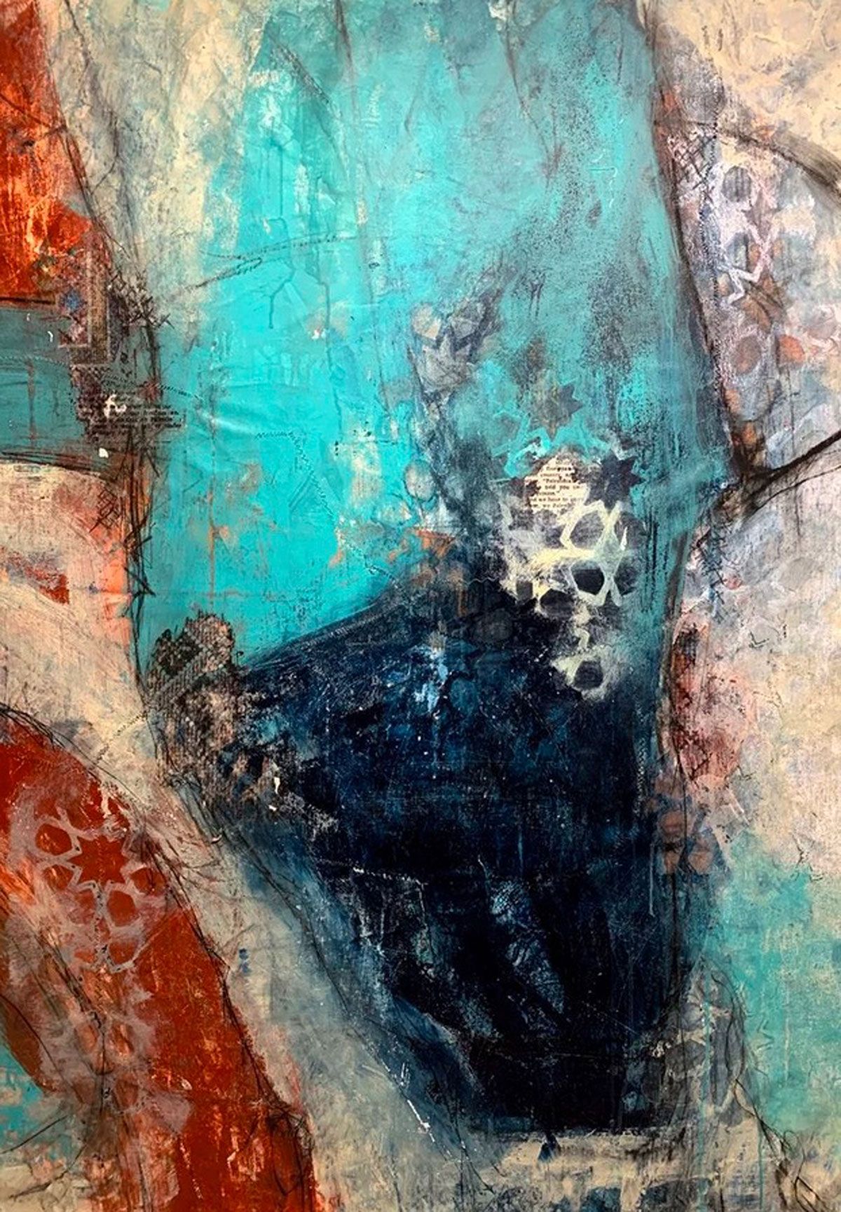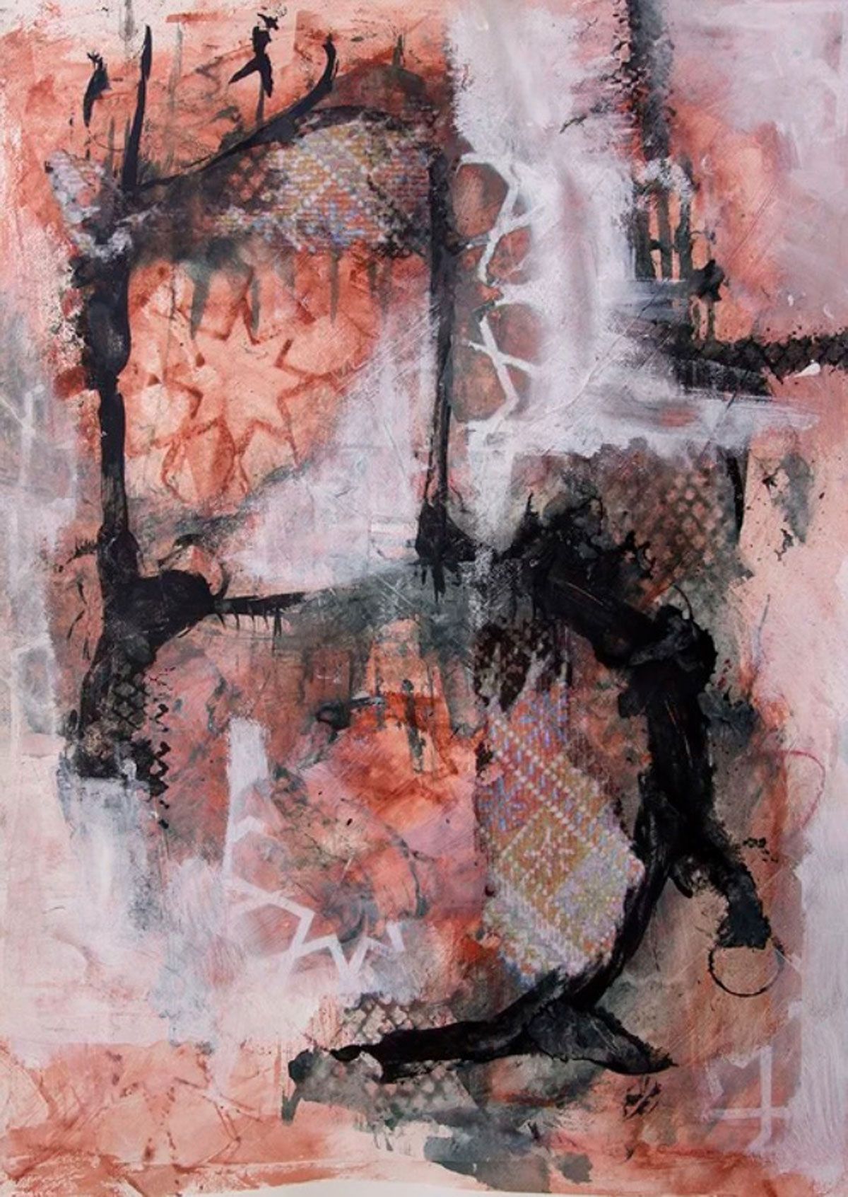 The use of abstraction references a layered history and vibrant culture that aims to tell a positive Palestinian narrative while exploring Arab feminine identity in society. The conflicting tension through overlapping layers of acrylic paint, charcoal, ink, collage, gold leaf, traditional elements, and language creates visual harmony drawing the viewer closer.