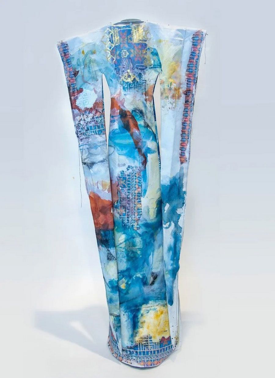 Each sculpted dress represents an identity and the story of scattered refugees whose culture and way of life have been fragmented; a diaspora, and a collective future standing resilient. It embodies families experiencing the tragedy of losing their homes, land, and way of life passed down from generation to generation. Conviction and strength reveal a drive that no amount of injustice can stop, the drive for self-determination, and the pursuit of hope for a better future despite hardship, adversity, and discrimination. My work is meant to inspire cultural and socio-political awareness and create a dialogue about living under occupation and those who are living in exile. To encourage the viewer to look beyond the media to learn more about the many challenges that are faced by a nation of scattered people who remain united by their culture, traditions, and love of their homeland.
