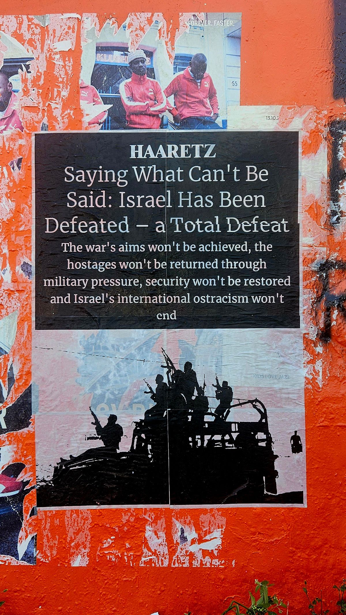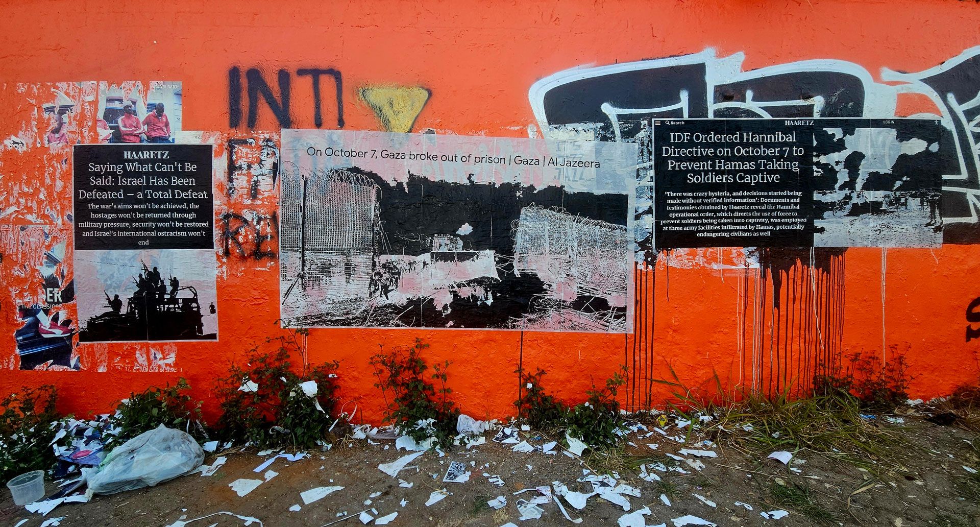 We began working for narrative repair on public walls in streets of Johannesburg, our first engagements coinciding with Oct 7 – wheatpasting screenshots from Al Jazeera “Oct 7 was a prison break”;  and two from Haaretz “Saying What Can’t Be Said: Israel Has Been Defeated – a Total Defeat” and “IDF Ordered Hannibal Directive on October 7 to Prevent Hamas Taking Soldiers Captive”.