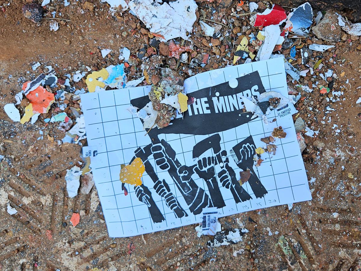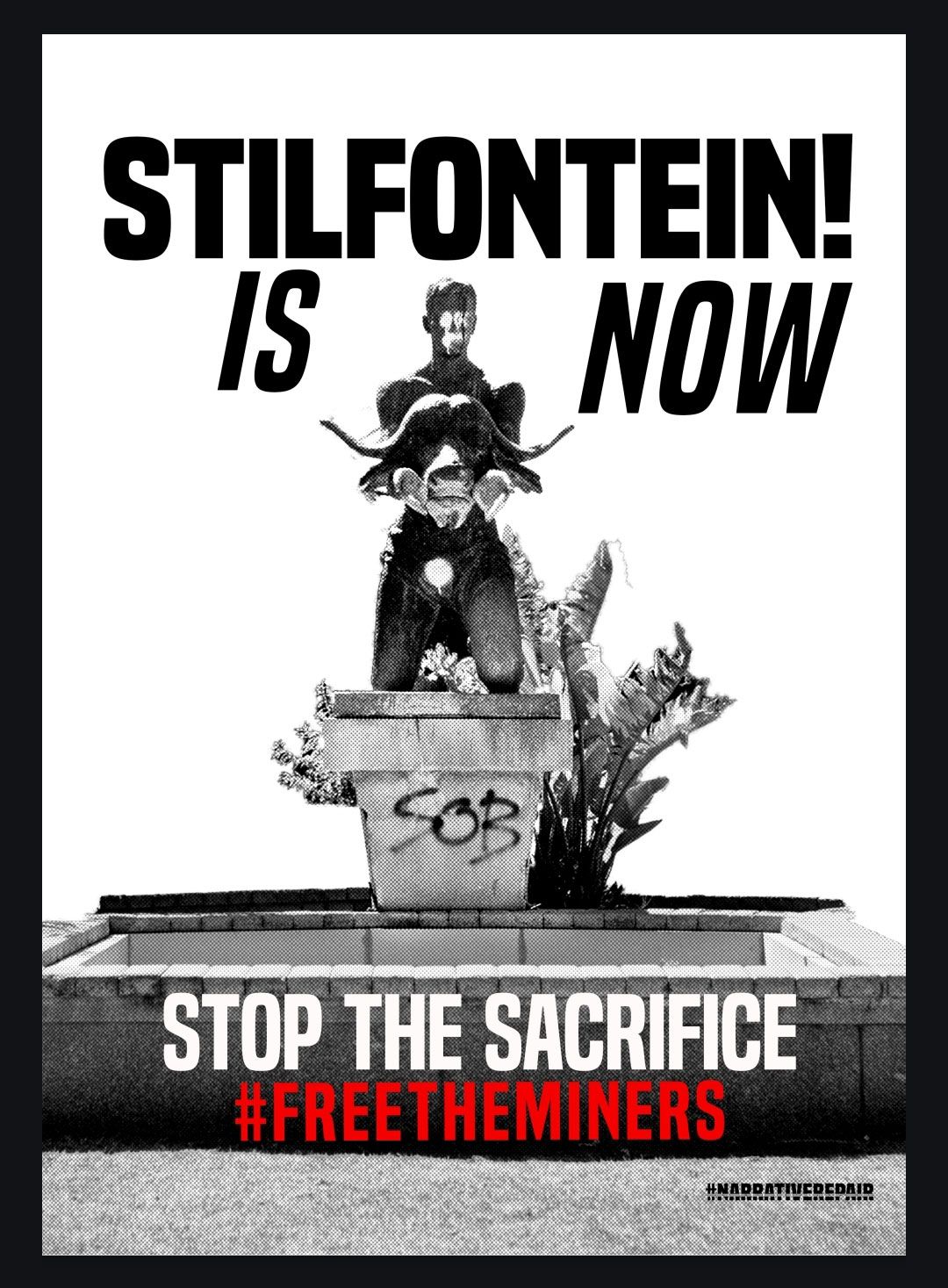 Haunted by Marikana, our first draft of the Stilftontein poster reads Remember Stilfontein, with the sigil of a skull wearing a miner’s hat.