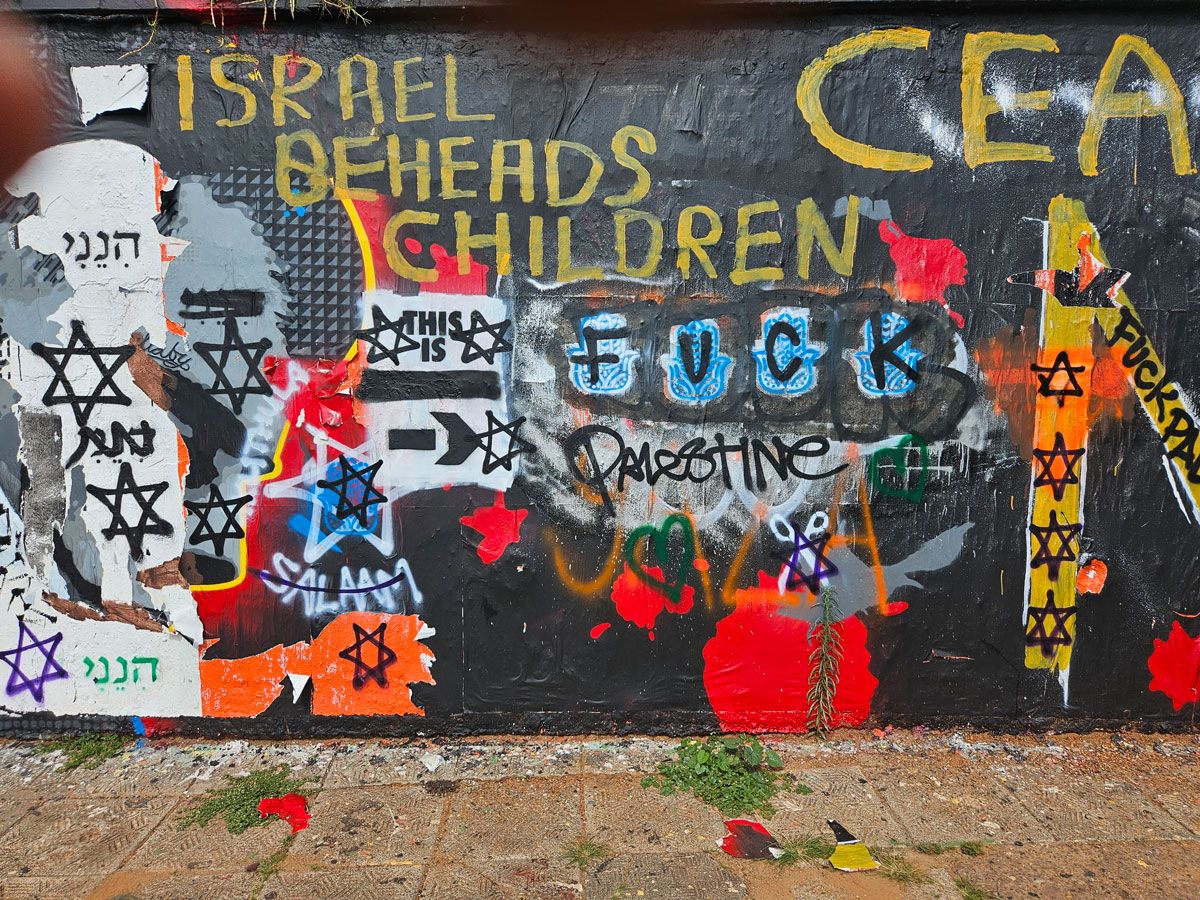 It stared with tags reading “Fuck Palestine”; “If you <3 Gaza so much buy a house there”; “Please go to Gaza” and “You’re not pals with any stinians” and the typical black marks of fascist censorship.