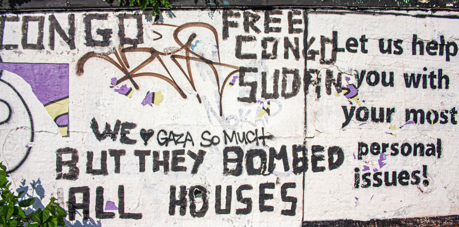 We returned, carefully repairing the texts with markers and fine line work. “If you <3 Gaza so much buy a house there – but they bombed all the houses”