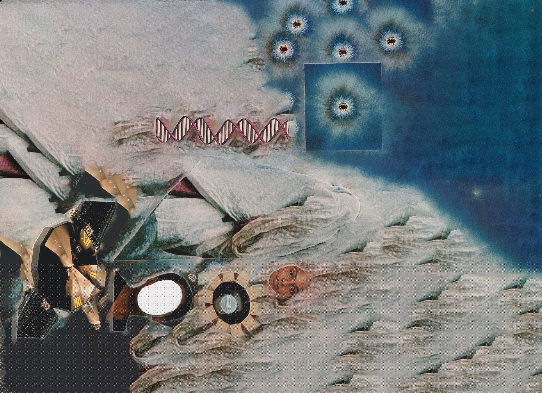 blk banaana is the code name that Duduetsang Lamola uses for her multidisciplinary work with collage, poetry, video and installation. Fictionalising dominant notions of temporality, place, nature, body, data, identity and belonging, her practice explores speculative reconstruction as a mode of resilience for fragmented identities rendered through colonial, anthropologic and algorithmic violence, and considers the role of myth and imagination in the retelling of history. The childlike imagination of nature is timelessly making multiple phases of itself. While we watch and pretend to forget that we are part. Our spirits and eyes transfixed by the white light distraction of webs being wound around us. This permeable film of fragility. Bondage made of shot nerves and tight blood veins. Body and mind dismembered. Our spirits dissected. Broken down into digestible cubes. Running from our boundless potential to remember who we are. Wound tight by the binds and binaries of the million legged lusus naturae. The freak of nature.