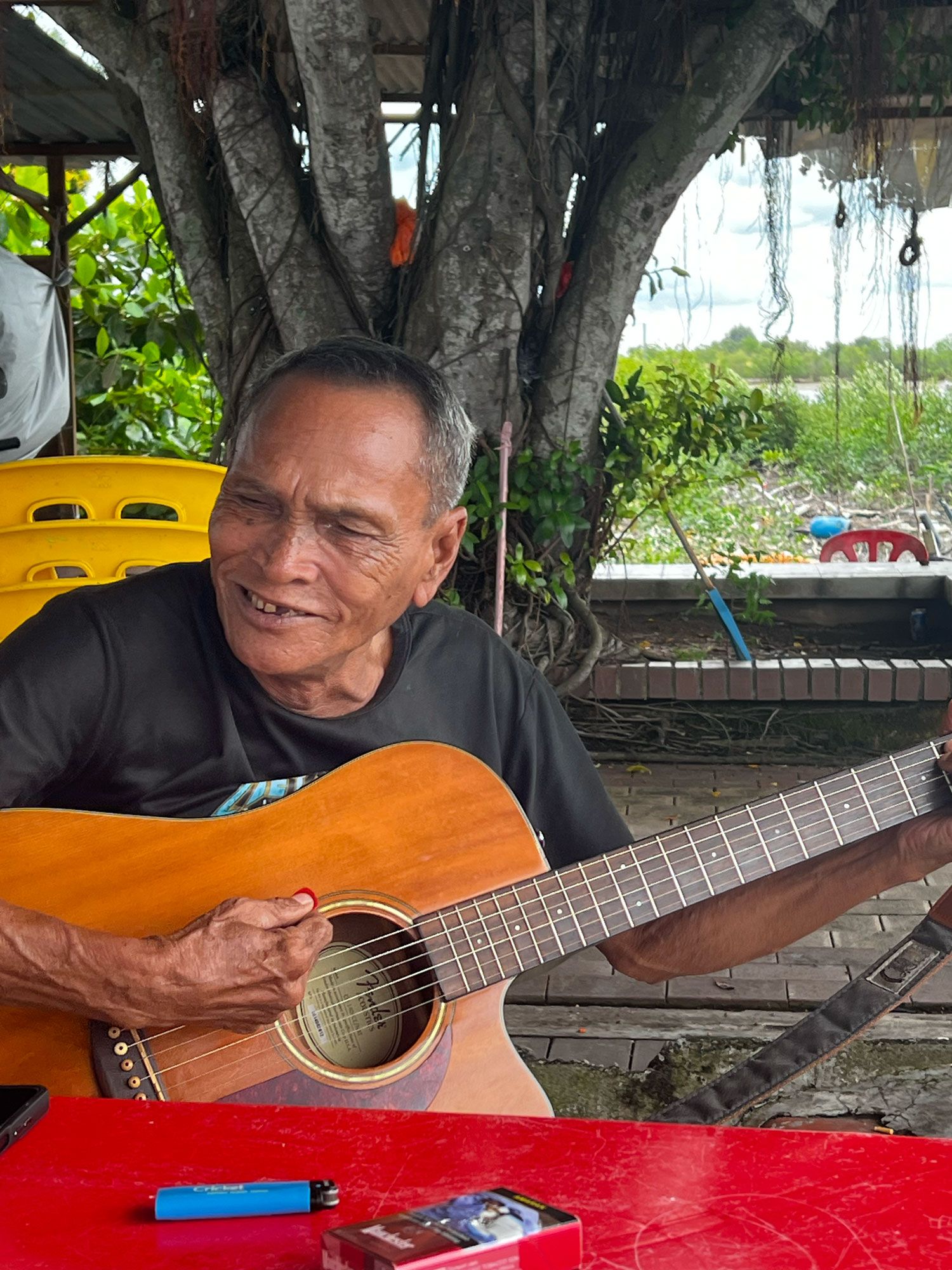 “You are looking for music?” he says. “I play for you. What do you like? Elvis?” He picks up his Fender and launches into Marie’s the Name, followed by Dock of the Bay.