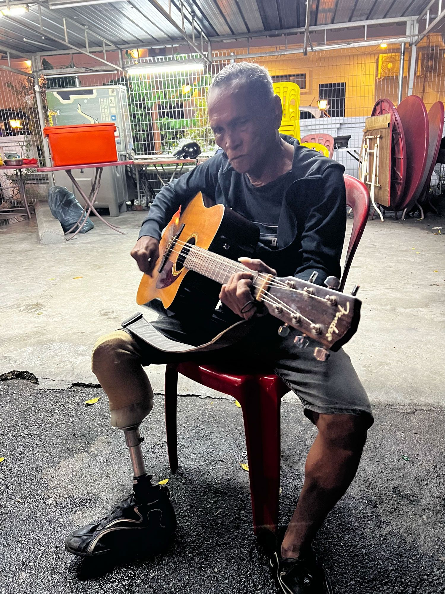 In the distance, I hear someone strumming a guitar and spot a lone player sitting in the shade of a stall at the other end of the promenade. I head in that direction where I’m welcomed by a man with one leg.