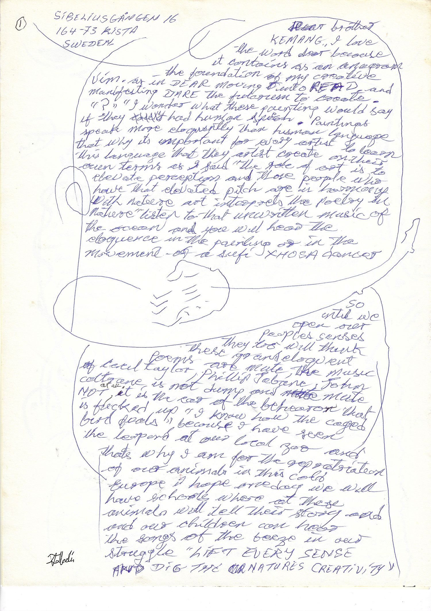 So until we open our peoples senses they too will think GQ (???) and eloquent poems are mute, the music of Cecil Taylor, Phillip Tabane, John Coltrane is not jump and mute not at all, it is the ear of the behearer that is fucked up. “I know how the caged bird feels” because I have seen the leopard at our local zoo and that’s why I am for the repatriation of our animals in this cold Europe I hope one day we will have schools where all these animals will tell their story and our children can hear the songs of the beaze (????) in our struggle “LIFT EVERY SENSE AND DIG THE NATURE’S CREATIVITY”