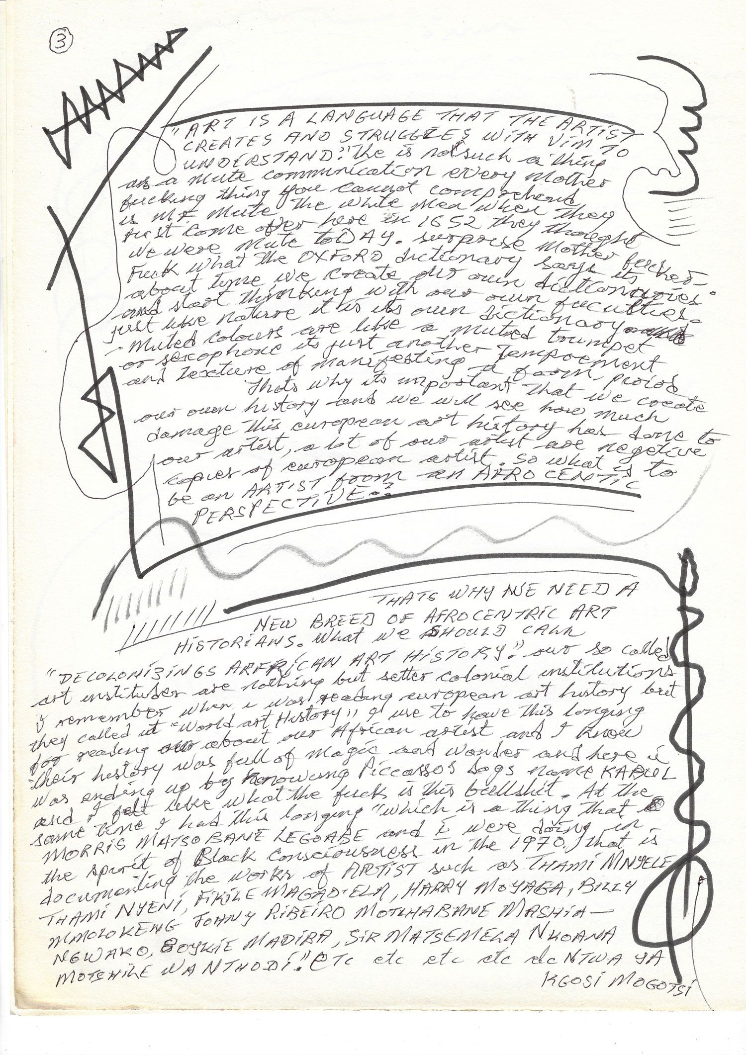 THAT’S WHY WE NEED A NEW BREED OF AFROCENTRIC ART HISTORIANS. What we should call “DECOLONISING AFRICAN ART HISTORY”. Our so-called art institutions are nothing but settler colonial institutions. I remember when I was reading European art history but they called it “World art History” I used to have this longing for reading about our African artists and I know their history was full of magic and wonder and here it was ending up by knowing Picasso’s dog name KABUL and I felt like what the fuck is this bullshit? At the same time I had this longing which is a thing that MORRIS MATSOBANE LEGOABE and I were doing in the spirit of Black Consciousness in the 1970s and that is documenting the works of ARTISTS such as THAMI MNYELE, THAMI NYENI, FIKILE MAGADLELA, HARRY MOYABA, BILLY MMOLOKENG, JOHNNY RIBEIRO, MOTLHABANE MASHIANGWAKO, MOYKIE MADIBA, SIR MATSEMELA NKOANA, MOTSHILE WANTODI. Etc. etc. etc etc de NTWA YA KGOSI MOGOTSI