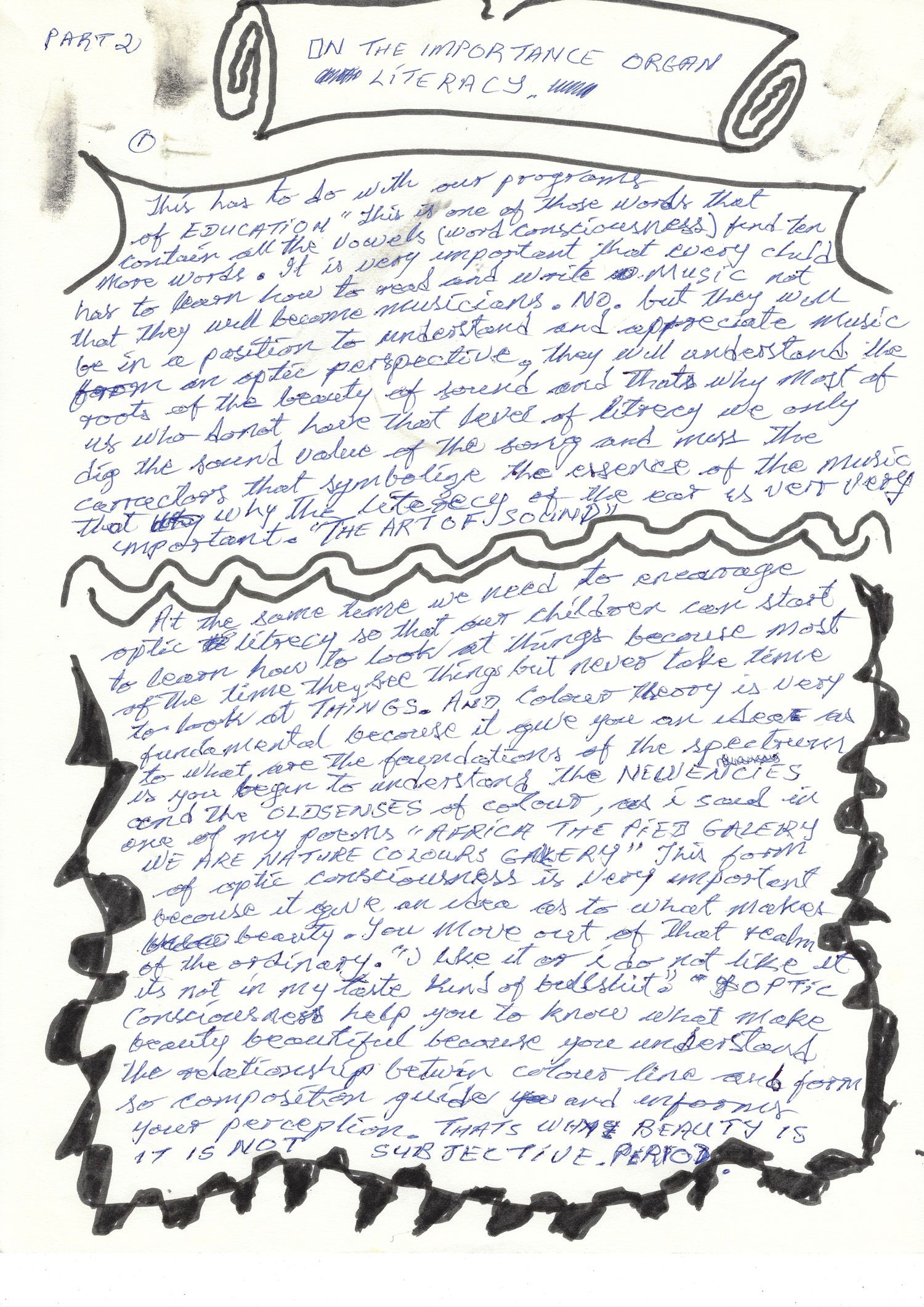 My brother it is very unfortunate that we come from this kind of fucked up background that the arts were designated to that group of people that were academically inproficient and that what my own parents told me that standard education was not designed for me and I would have some form of future if I played some drums and I did play drums like a motherfucker. The point I am making is that through consciousness and hanging out with hip I mean arts hip cats especially guys who understood the power of the ARTS, that I was introduced to the artist as a creative thinker and came to understand and how I overstood that the arts are for that group of THINK TANKS and not for the lackadaizical. And that to say the artists are those group of people that design the sanity of a civilization, and that’s what our arts academics should be all about and cut the B.S.