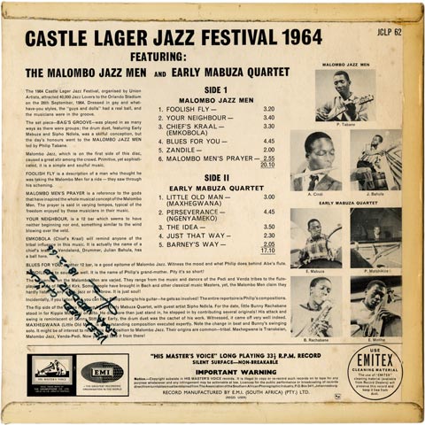 However, the marked dearth of activism in organised resistance politics, would be switched for birth pangs of a new awakening. Jazz music and other creative cultural activities rose to fill the void. On the 26th September, 1964 a gathering of over 40,000 jazz lovers in Soweto, Orlando Stadium would witness the triumph of ‘Malombo music’ pointing out a path to pride and people power. The Castle Lager Jazz Festival, organised by Union Artists, became something more than a regular musical event.