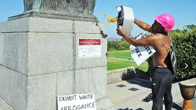 The flinging of poo on Rhodes’ statue at the University of Cape Town on 9th March 2015 by Chumani Maxwele, a fourth-year political science student triggered a series of events that culminated in student protests across the country. Standing shirtless in front of the large, looming statue wearing a bright pink mineworker’s hardhat, Maxwele said he “felt suffocated” by the overwhelming presence of colonial names and memorials on the campus, and complained that most black students couldn’t breathe on campus because of the claustrophobia produced by English colonial dominance at UCT. “There is no [black] collective history here – where are our heroes and ancestors?” he asked a large group of students and journalists before emptying the container of human waste onto the statue (Cape Times 11 March 2015, p.4).