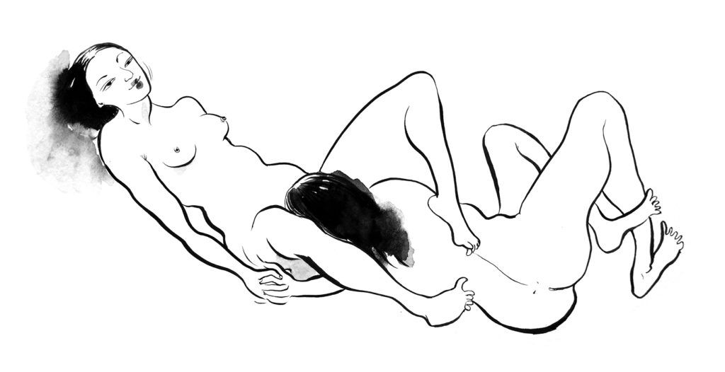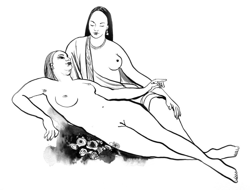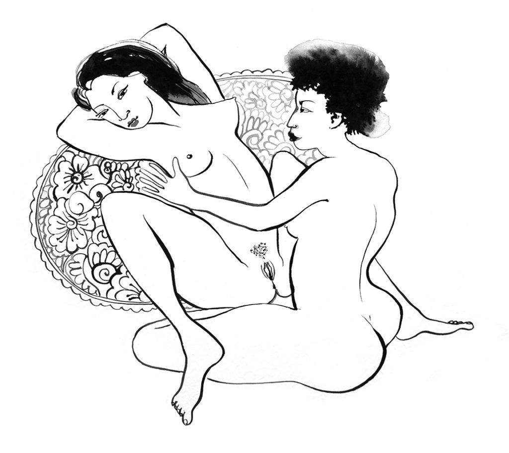 This anthology is more than just a collection of short stories but it is an artistic expression about love. The illustrations and cover are designed by Andrea Rolfes, she uses pencil-like sketches to create a cinematographic feeling of intrusion for the reader. You are exclusively invited to the lives of lesbians and you are an audience in an intimate setting. The illustrations often have dark or invisible eyes to mark shame and deep moments of pleasure. They give dignity to a small book that starts badly. Rolfes articulates the erotic by drawing out vaginas and breasts explicitly. This works well with Vasani’s sexual and erotic writing. The background of the illustrated women often resembles a cosmic blanket found in the galaxy. This part is a deliberate protest by the artist to affirm that lesbian love is holy and out of this world.