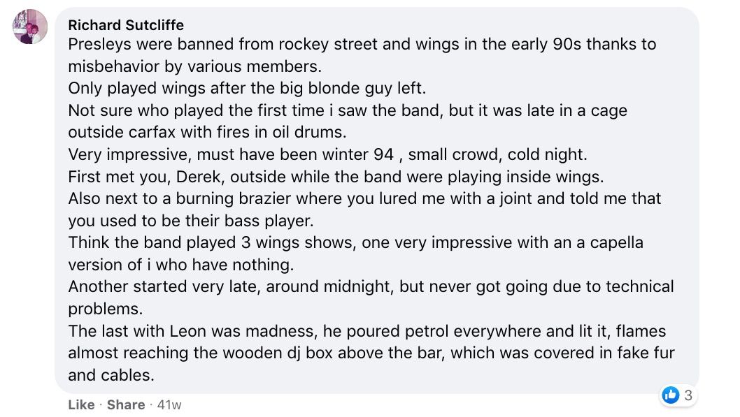 Live Jimi Presley were essentially a socio-political performance band who used metal percussion like car springs and angle grinders and they had a fire eater who blew balls of flame above the audience’s heads.
