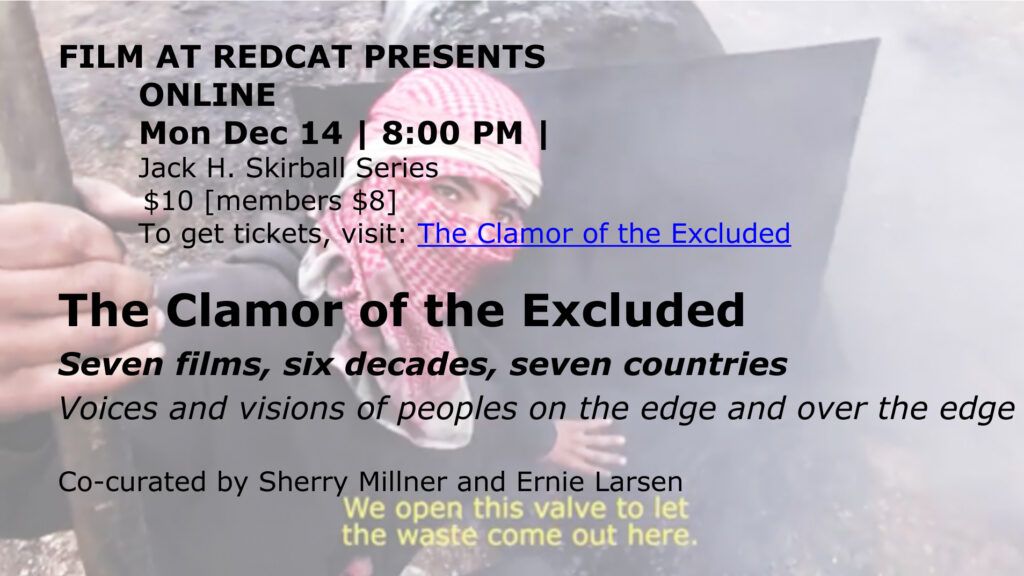 All that said, and believed and experienced, in early December 2020, in the still dire suspension of the pandemic, we lived through the virtual inverse of these conditions and expectations for a globalcast of a screening, as graciously invited by Berenice Reynaud, curator at RedCat, located at the grand Disney Hall in downtown Los Angeles. This would be a more-or-less conventional venue in normal times but we put together what I called The Clamor of the Excluded, a mix of seven films, made over the course of six decades, in seven countries, “voices and visions of peoples on the edge and over the edge,” in this way evoking the potential reach of the locked-down audiences stuck in their homes, wherever they might find themselves—as were we, in New York City, three thousand miles from RedCat.