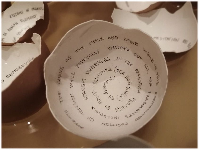 Inscribing: Confined concentric scripting onto the inner surfaces of the eggshells with a set of fine point archival ink pens (0.15mm – 0.20mm line). Where the eggshell membrane remains, that is, not removed during the cleansing process, the surface is smooth and shiny as opposed to the eggshell surface (stripped of membrane), which is more porous and textured, therefore more resistant to the pen nib and ink flow. The restricted posture of physically writing out every sentence of the research process by hand, affects the curve of the neck and spine held in tension to transcribe all the fragments, sentence (per eggshell) by sentence. The ink runs dry, the fingers cramp up, or the mind grows weary and commits errors. Such moments of frustration are however alleviated by the great satisfaction of hand-crushing the typos immediately. Instant pain. Proximate pleasure. And begin again… producing fifty thousand words across approximately five hundred eggshells to weave the dissertation passage by. As I try to hold a comfortable working tension while keeping labour regulated, I begin to reflect upon the installation room of my mental projections. Foremost is the meditation on scale, how scale frames… for me the “bigger picture” is never a high definition shot, but the closest parts are always in focus. Of course a balanced view requires a constant shift of focus between the whole and the parts. As a visual artist one has to constantly shift the register of scale to realise one’s vision. What first comes to mind is an image of limitless dimensions but as that image is realised in practical terms of the material world, proportions must be more carefully considered. The minute scale of my inscribing activity allows me to be in the moment, confined by focus and attention to the parts (sentences) that make up the whole (fifty thousand word document). My scope is limited for good reason. If I can effectively cover the floor of the room, with every sentence accounted for, the physical aesthetic labour of my writing is done. A floor full of fabricated ruins that carry the drawn out process of writing a dissertation of my practice. However, with these shells being destined for destruction by their original conception, that is, reduced to shards upon the viewing process of the installation (being walked upon in order to examine the elevated objets d’art), they provide another meditation on violence. This crushing procedure is in line with my self-inflicted spellcheck system, in terms of sacrifice, discipline and punishment. The text that serves to quantify and qualify the art must be sacrificed to behold the art. Would that crushing component of the activated installation count for the sadistic (spiteful) or the masochistic inclination of mine? To have my words literally crushed by other soles. Am I in terms of a “divided self” the sadist of my own masochist? “Don’t cut off your nose to spite your face” was a regularly repeated phrase of warning throughout my childhood. The inscribed shells are stored once again in their trays. In the virtual version of this work’s “activation” (online, as opposed to the physical and material participation of the audience crushing the artwork) I am limited to the audio and visual immersive potentialities of the website medium.