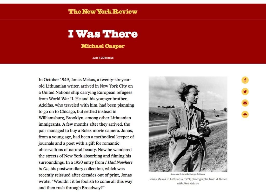 Na zijn overlijden op 23 januari 2019 in New York verscheen er één in memoriam over Mekas in een Nederlandse publicatie. Koen Kleijn, die deze mooie tekst voor De Groene schreef, bekende me later dat hij nog nooit een film van Mekas had gezien. Nooit. De herinnering aan een toevallige ontmoeting in 2010 op een terras in Vilnius, hoofdstad van het huidige Litouwen, en een ter plekke geïmproviseerd interview, vormden de aanleiding en het hart van zijn i.m. Het is tekenend voor het charisma van de toen achtentachtigjarige Mekas dat hij slechts een enkele ontmoeting nodig had om Koen te charmeren, zodat hij terug in Nederland I Had Nowhere to Go en Mekas’ gedichten uit de jaren veertig en vijftig ging lezen.
