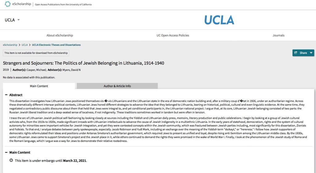 Ik ben nieuwsgierig waarom Casper in Litouwen is gaan vissen en waarom hij Mekas in zijn net wilde hebben. Een glimp van zijn eigen achtergrond, zijn biografie, zou wellicht iets kunnen aandragen dat in het artikel onuitgesproken is gebleven. Historici laten meestentijds weinig van zichzelf zien, behalve misschien in nawoorden en dankbetuigingen, maar het lukt me niet zijn proefschrift in te zien. Bij de afdeling Electronic Theses and Dissertations van UCLA lees ik dat de tekst van Strangers and Sojourners: The Politics of Jewish Belonging in Lithuania, 1914-1940  tot 21 maart 2021 onder embargo is. Ik moet het doen met een korte samenvatting van één alinea. Op mijn verzoek of hij mij de digitale versie wil toesturen, heeft Casper nooit geantwoord, wat vreemd is voor een wetenschapper. Zelf voorzie ik elke student of vragensteller, zelfs de krakkemikkig of lui geformuleerde e-mails, van informatie over mijn films.