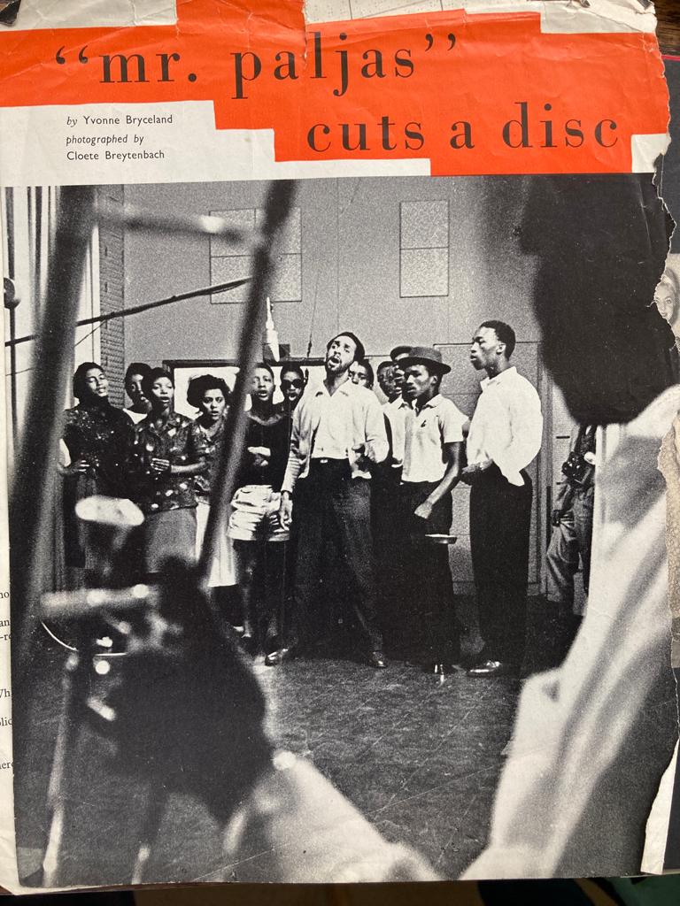 I always wondered about the identity of the photographer. But did not get the answer until earlier this year when visiting South African actor/writer/poet Ruth Rosen (née Abromowitz) – a friend of Mona’s from way back. Resident in London for many years Ruth was fully involved in Mr. Paljas as the Speech Coach. Photos and cuttings she shared at our meeting included fragments from a magazine article “Mr Paljas Cuts a Disc” – text by Yvonne Bryceland (later acclaimed for her role in Athol Fugard’s play Statements After an Arrest Under the Immorality Act) and photographs by Cloete Breytenbach.