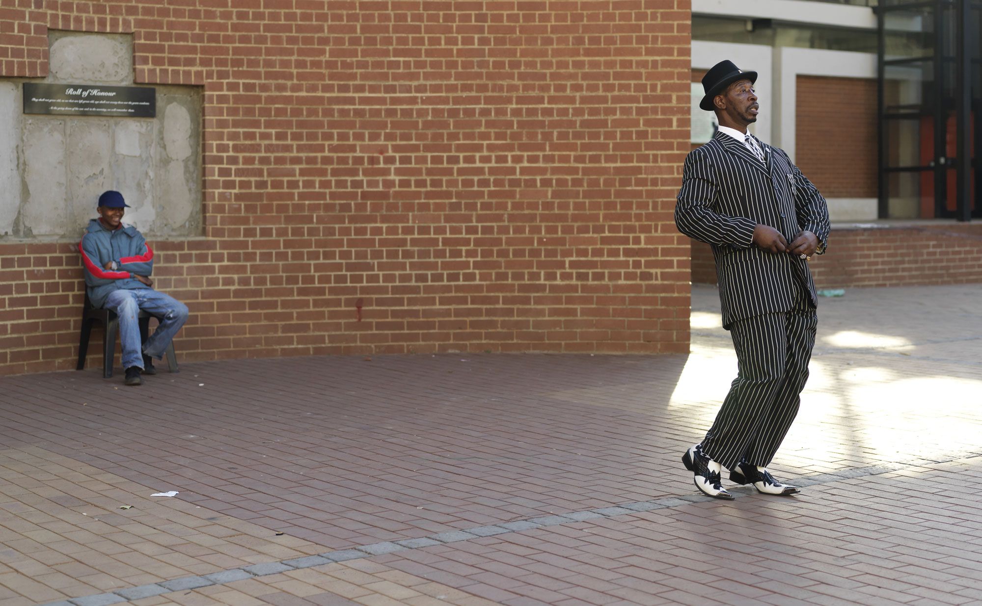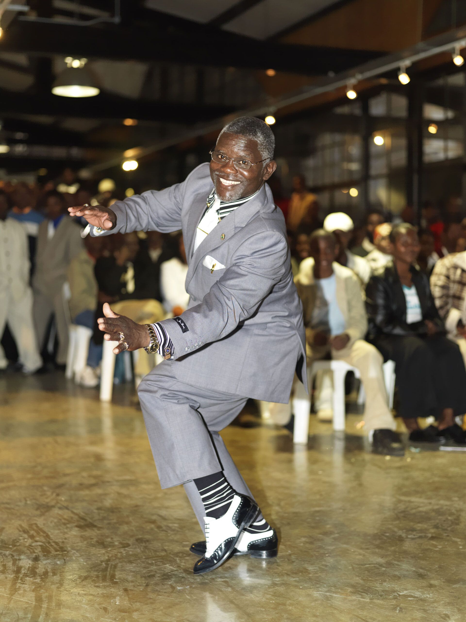 ‘We started this thing many years ago … The swankers were born to the scathamiya groups, because we used to sing at night. Now, when it’s 12 o’clock, we weren’t allowed to go in the street, because at that time … apartheid … we needed passes or permission. We wouldn’t walk in the street … because the police can arrest you. So that’s why we started swanking when we finished singing…’