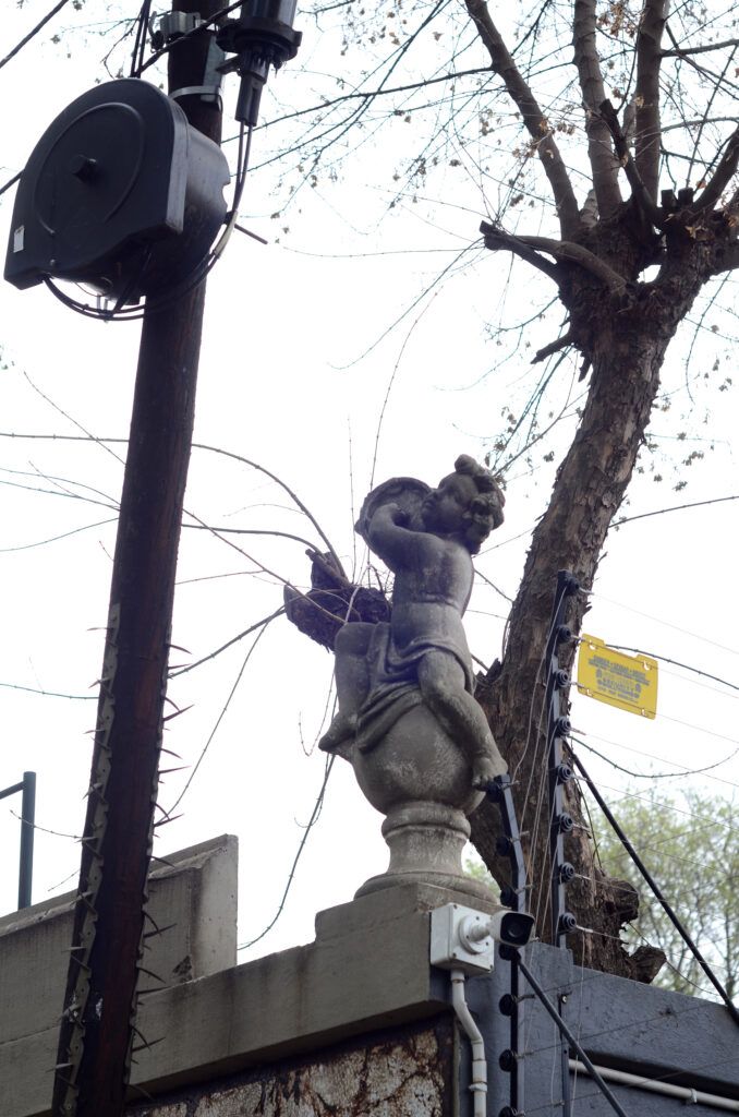 This composition says four things at the same time: 1) I am watching you; 2) stay the fuck out of my space; 3) I can’t do without power, and 4) in between all of that, I’m trying to make my property appear elegant. I’m not sure the combination works.