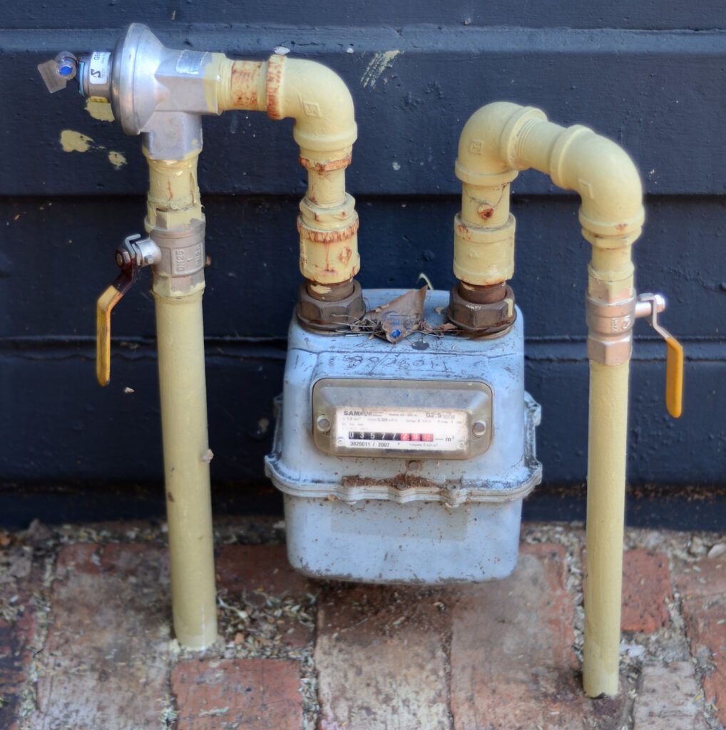 A gas meter squats grotesquely between its inlet and outlet pipes.