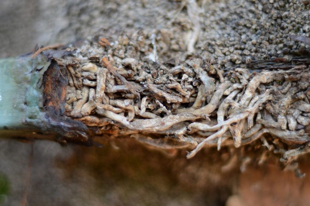 These roots have actually grown through a hollow metal rod that forms part of a boundary fence.