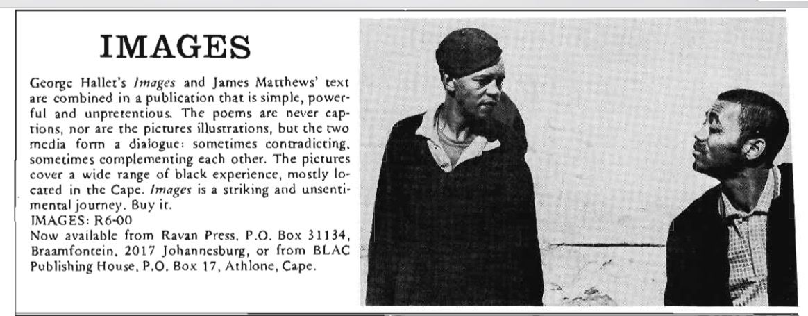 “I first wrote because of my background; my short stories dealt mainly with poverty,” Matthews said in an interview with Daniel Magaziner.[5]Interview with James Matthews “I then became more interested in trying to write about the political situation, how it effects and not too much the political situation with slogans – the people’s sayings, the people’s suffering and not an ideological party.” But by the late 60s, Matthews’ trajectory was taking him towards greater stridency. His prose was not militant enough, he said. He felt shackled by the requirements and conventions of the short story, he told Magaziner. “With the poem, I form my own structure,” he said. He further noted that his stories lacked the militancy of Cry Rage.