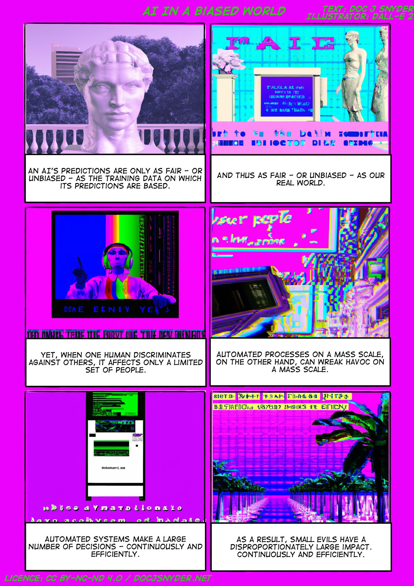 For the selection of the final image, which you can now see in the comic essay, I followed a simple set of rules in order to avoid opposing or distorting the BIAS as much as possible with my own BIAS: for the first panel, I used the image on the far right, for the second panel the image on the far left, for the third panel again the image on the far right, and so on. The result is the final comic “AI in a Biased World”.