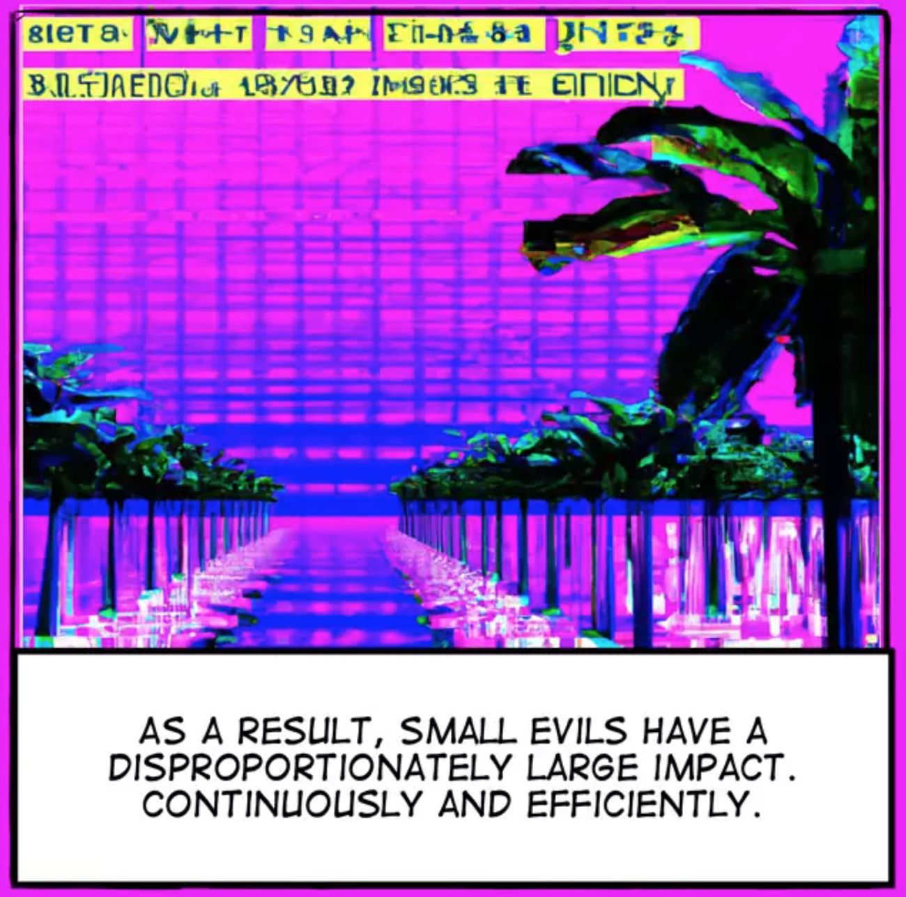 Here’s how I proceeded: I entered the exact text of each panel (image-text tile) as a so-called “prompt” into the image generation program, flanked by an aesthetic instruction: vaporwave (a genre of psychedelic music and art of net culture). The dall-e 2 program always gives four images to choose from.
