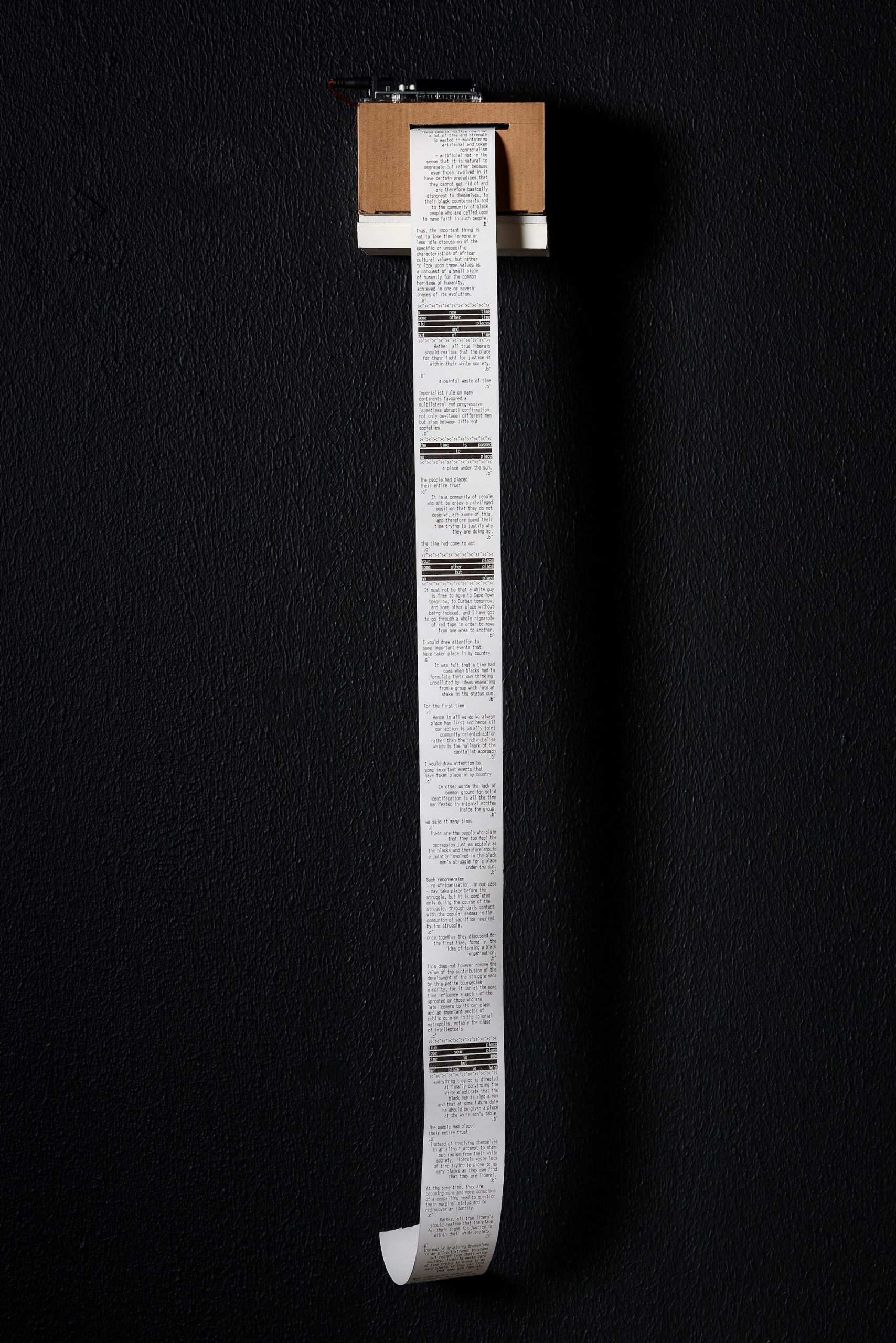 My work recently has involved collecting idiosyncratic datasets drawn from the archives of black liberation theory. In biko.fanon (touch/hold) (2018) a dataset is created of all sentences mentioning the words touch and hold in the work of black consciousness theorist Steve Biko and revolutionary psychiatrist Frantz Fanon. This dataset is then recombined using a pseudorandom script to print a scrolling receipt of a conversation between these two figures about touching and holding. I had been thinking about this machine as a performer translating a conceptual proposition on a stage, a performer summoning spectres from the near past. Machine learning presents us with an opportunity to reconceive this kind of relation.