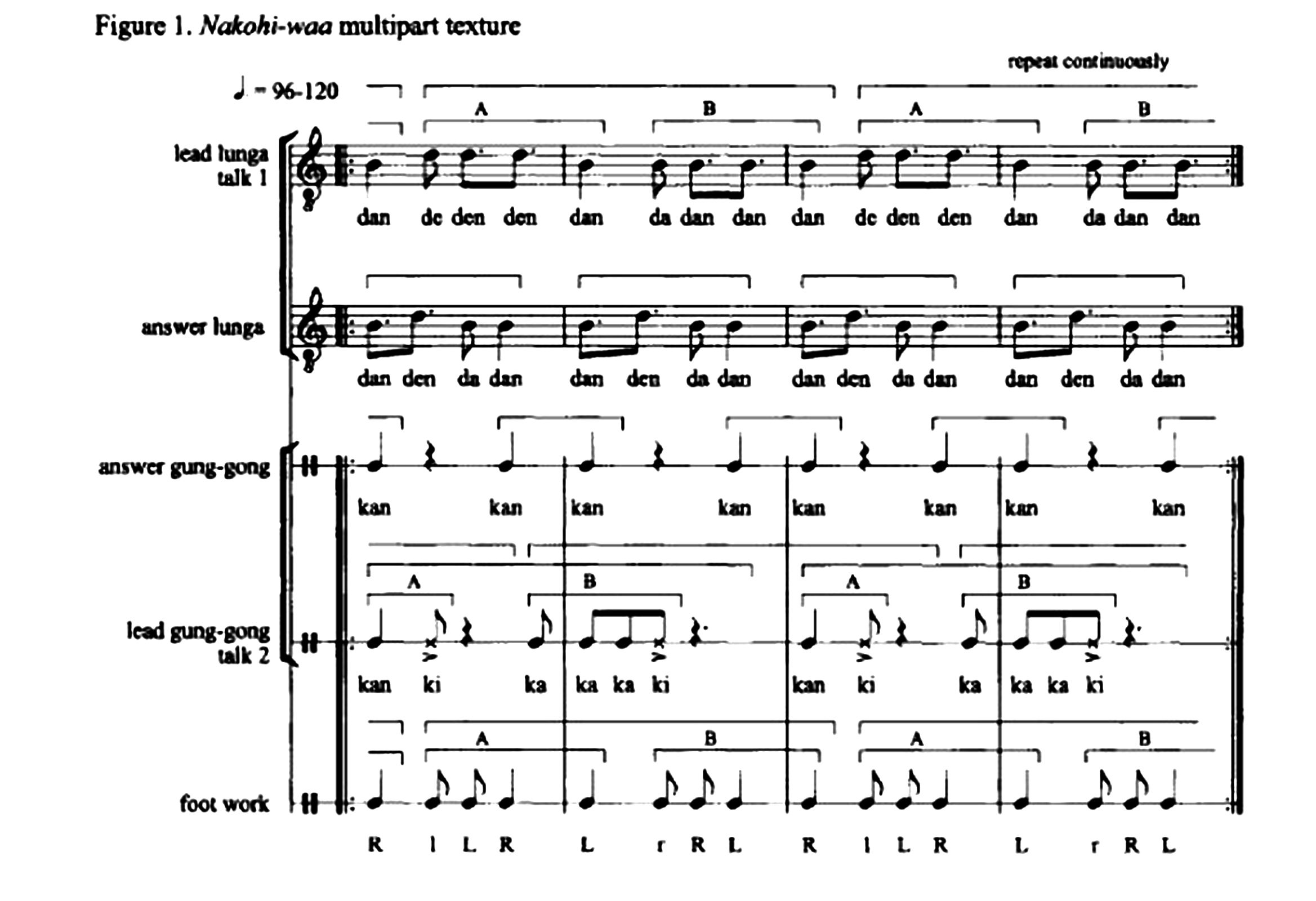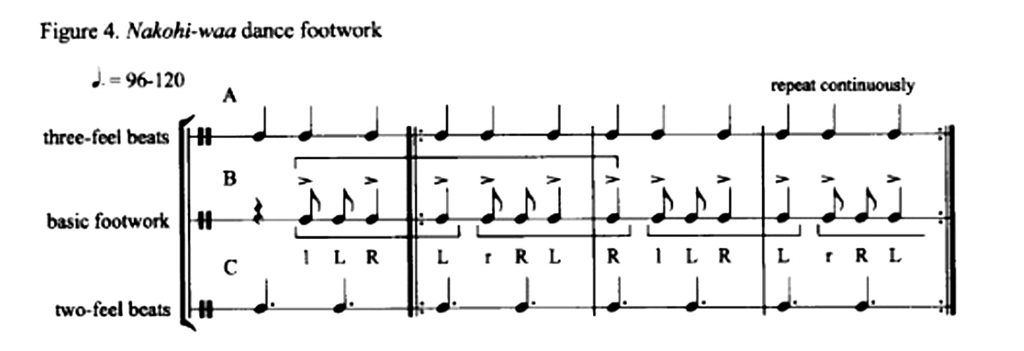 As is the case in many of the world’s performance traditions, dance frames music’s temporal period and helps establish the fundamental patterning of musical time (see Figure 4).[20]I discussed my dance lessoons on Nakohi-waa with Madame Fusena Wombei in an unpublished paper presented at the Annual Meeting of the Society for Ethnomusicology, 2003.