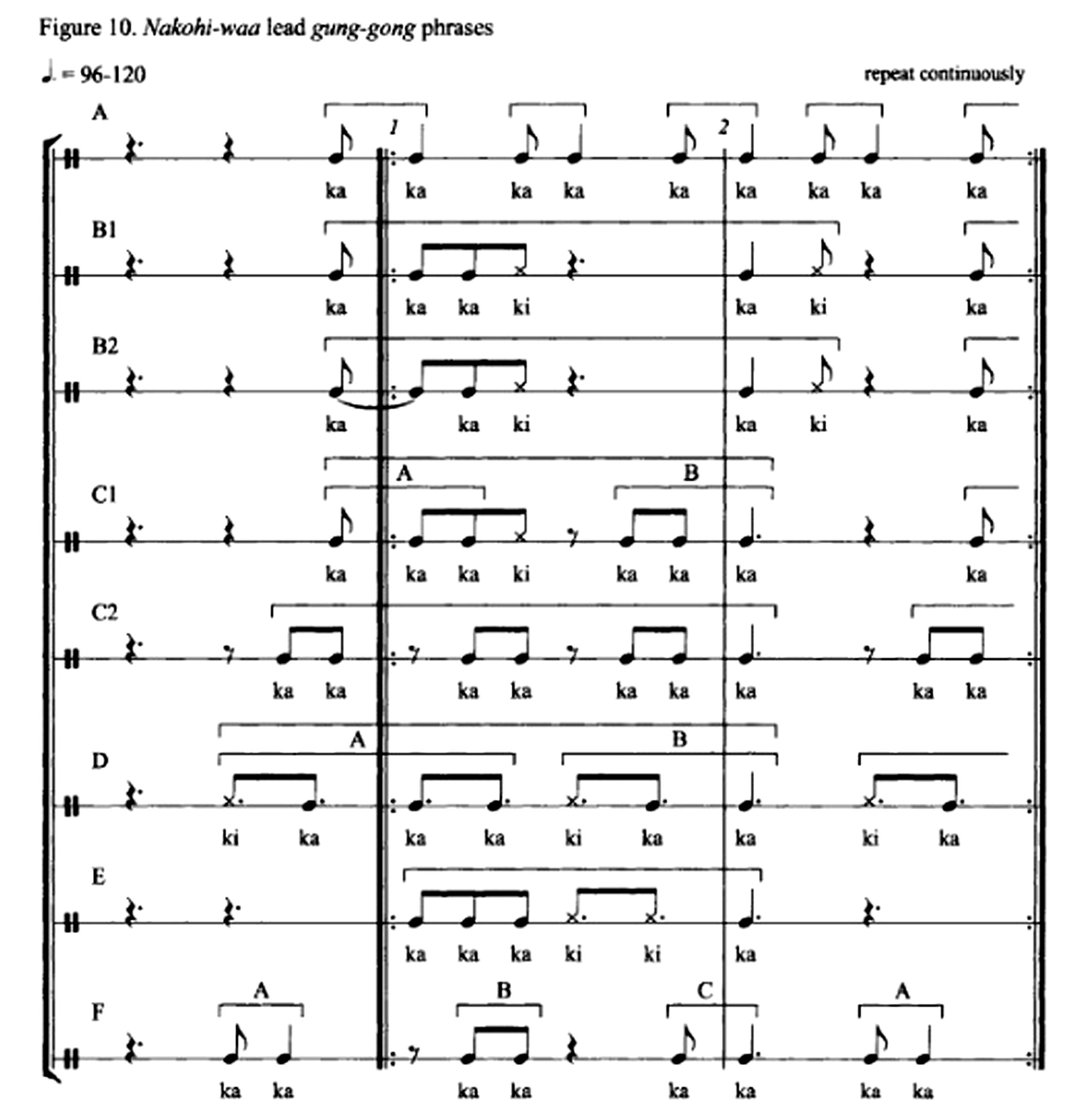 Now, I introduce eight phrases for the leading gung-gong drum to illustrate how a player energizes the multipart texture of Nakohi-waa by knowingly selecting variations that harness the power of simultaneous multidimensionality (see Figure 10).