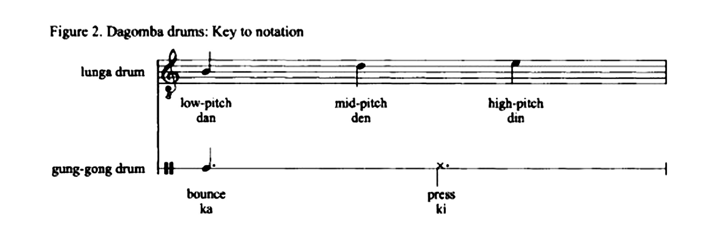 Two types of drum are used: the hourglass-shaped tension drum (lunga) and the cylindrical-shaped bass drum (gun-gong). The ensemble has four roles: lead lunga (one drum), answer lunga (many drums), lead gung-gong (one drum) and answer gung-gong (one drum). This paper discusses the presence of simultaneous multidimensionality in the nexus of phrases that Alhaji Abubakari taught to me as the inherited tradition of Nakohi-waa. I argue that this concept yields elegant and meaningful musical analysis and suggest that the art criticism of cubism raises topics of value to music scholars.[11]Chernoff brought attention to Dagomba music-culture in his interpretive treatment of African expressive culture (1979); his paired film and article are a more traditional ethnographic account (1984). Chernoff has in progress a comprehensive study of Dagomba cultural history. Djedje’s comparative study of Dagomba and Hausa one-string bowed lutes establishes a regional setting for this style. A website hosted by Tufts University presents a large body of text, graphic and audio materials on Dagomba dance-drumming music (https://sites.tufts.edu/dagomba/the-dagomba/).